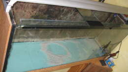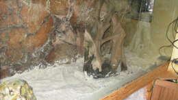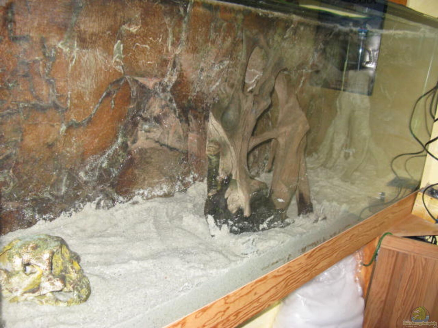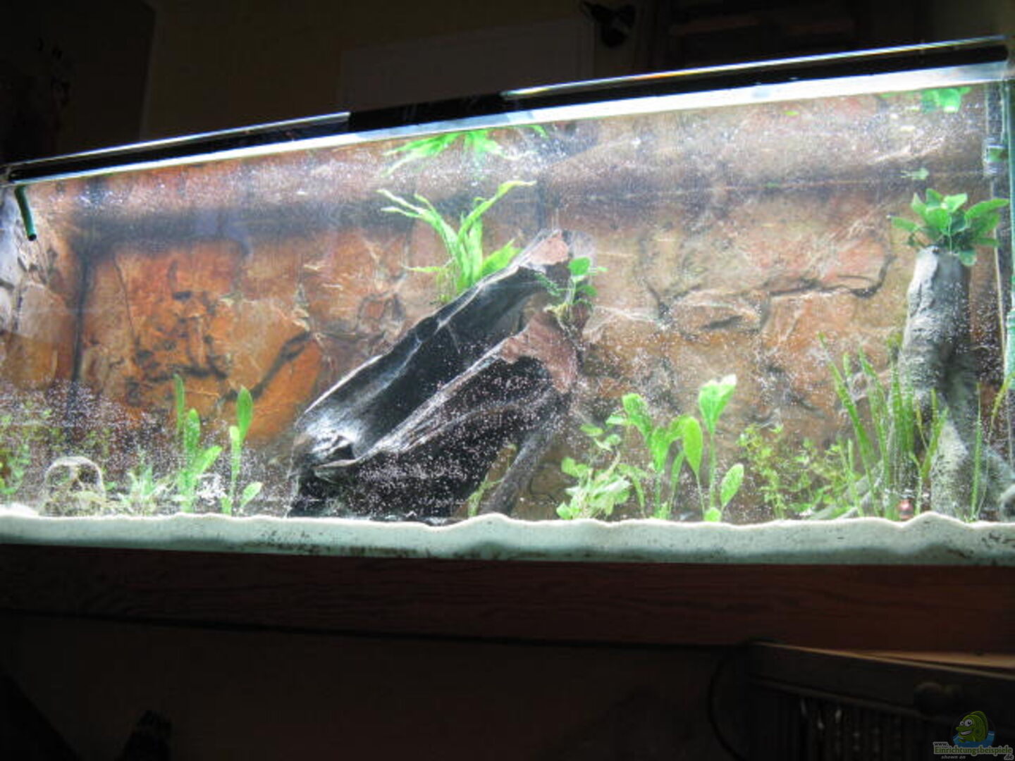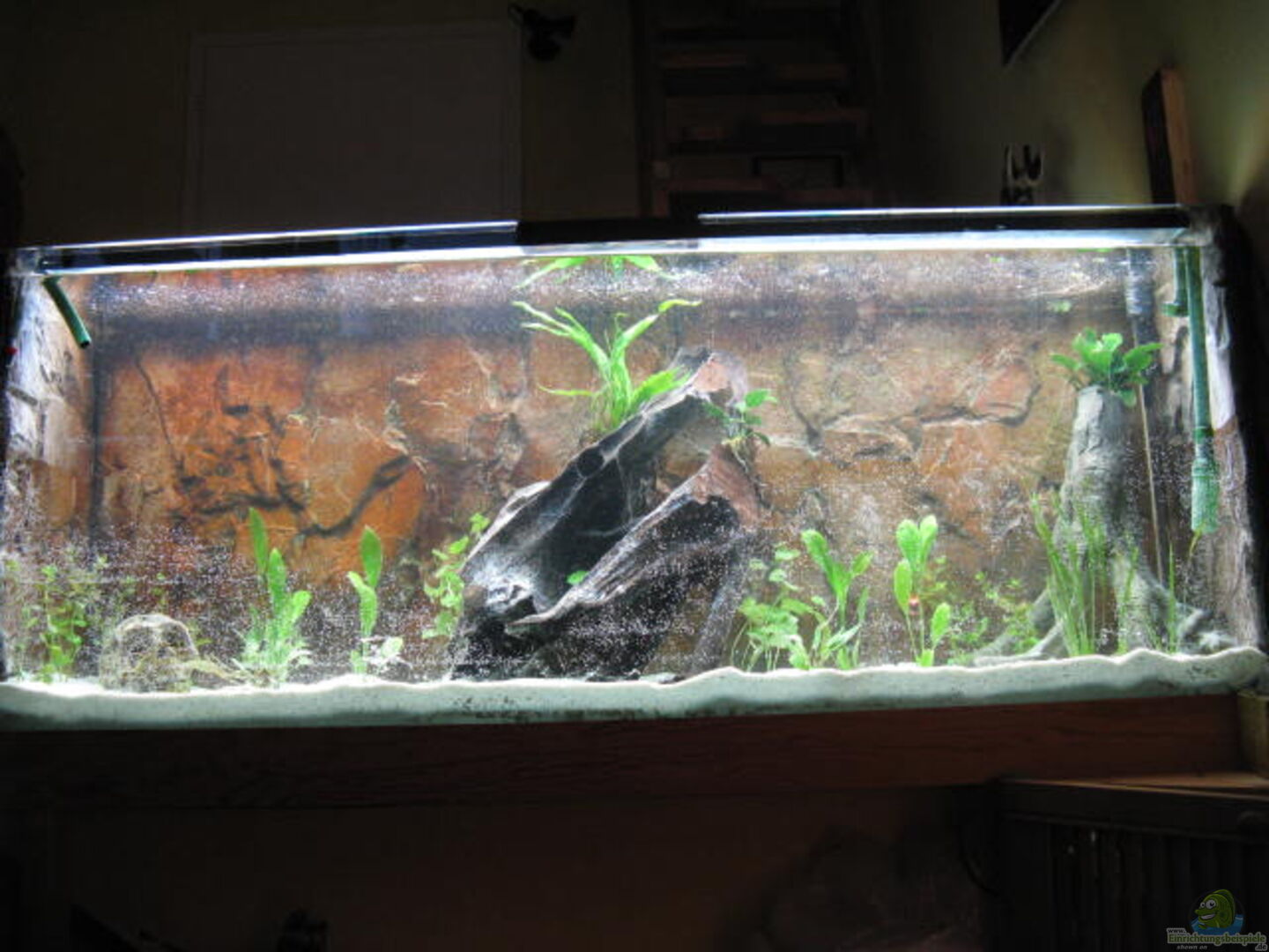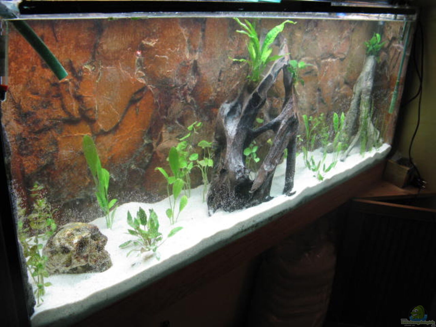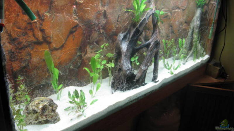 27.2.2008 Sand, Wasser und eine künstliche Wurzel sind endlich drin. Filter und Heizer laufen. Die zweite echte Wurzel kommt morgen rein. Leider kommt die T5 Lampe die ich im Internet bestellt habe nicht an laden. Also, müssen die Pflanzen noch so lange warten.