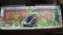 Die gro?e Wurzel passt sehr gut, vielleicht kannst du ja die (linke) Schnittkante noch durch eine gro?e Pflanze oder Moos kaschieren, sieht dann noch natürlicher aus. Schickes Becken - ok, der Schädel..... ;-)
