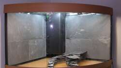 Schieferplatten; Bodenfliesen aus dem Baumarkt mit Aquarien-Silikon an die Scheiben geklebt.