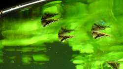 Entgegen aller Literatur und Infos auf dieser und anderer Seiten, lieben meine Tiere die Strömung im Becken. Allerding scheinen sie auf dem blauen Streifen den Schriftzug zu tragen "da könnte was fressbares kommen!" In der Nacht hingegen ziehen sie sich in den Schutz der Pflanzen zurück. Ihre, wenn auch nur entfernte, verwandschaft mit Piranhas und anderen Raubsalmlern, können die Tiere nicht leugnen. Das einfache "klack" des Futterautomaten fürt zu tumultartigen Szenen an der Wasseroberfläche :-). Der Versuch, die Neons mit Flockenfutter aus dem Bild (für ein Foto) zu locken, ist an dem fehlenden Geräusch gescheitert. Bis die Flocken ihre Runde auf der Wasseroberfläche zum Filterauslass gedreht hatten und so die Aufmerksamkeit der Neon auf sich zogen, war mein Motiv längst verschwunden..... :-(. Beim fressen sind die Neons echt gierig. Sie fressen so schnell, das das Flockenfutter erst in ihrem Magen das Wasser aufnehmen kann. Dadurch blähen sich die Bäuche auf und die Fische schwimmen fast Kopfüber und "schiessen" nach unten. Dauert so ca. 15min. Die ollen Gierhälse...:-)
