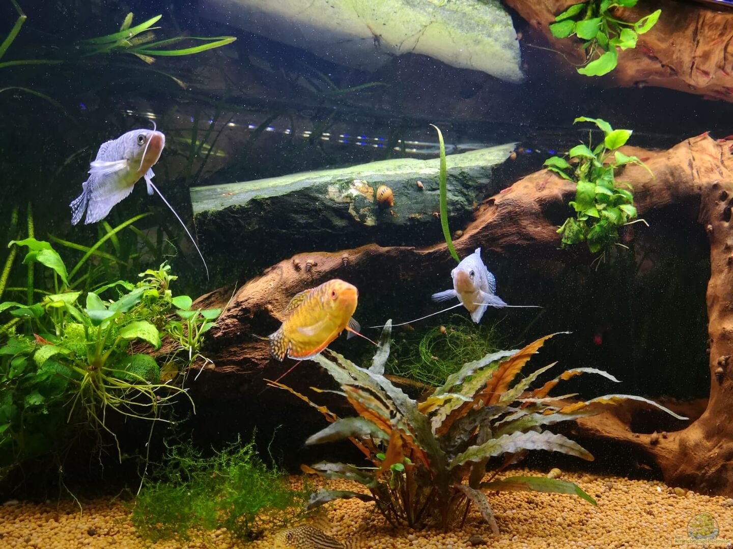 3 marmorierte Fadenfische (Trichogaster trichopterus). 2x Blau und 1x Gold. Das goldene Weibchen ist leider verstorben.