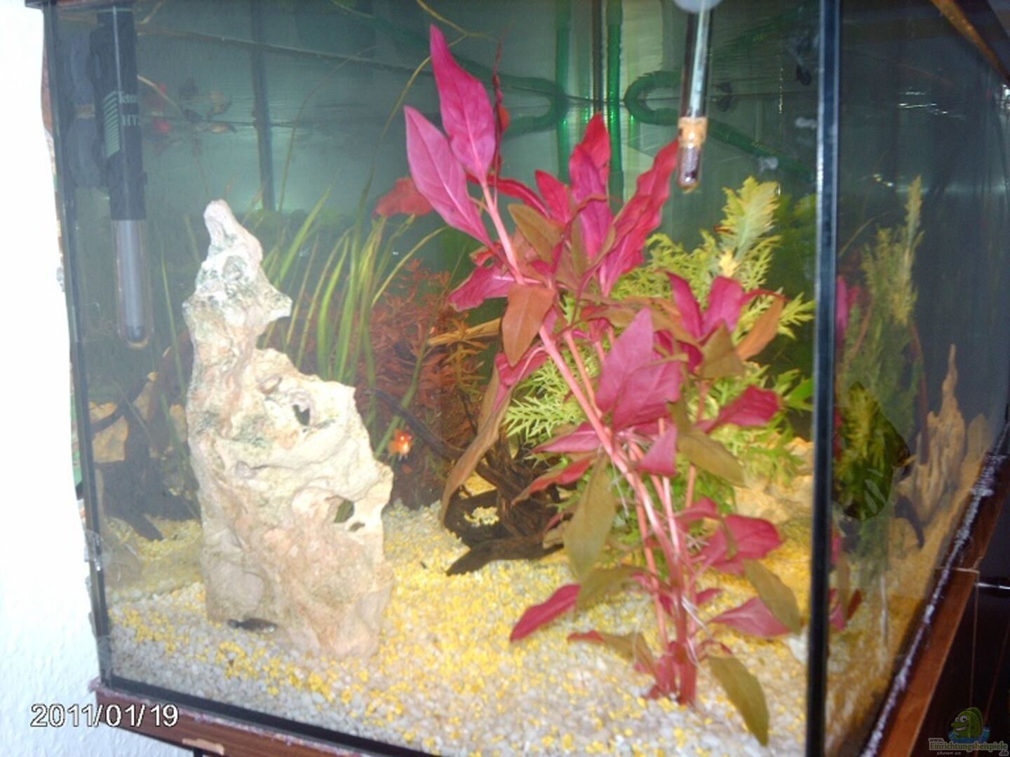 Das Lochgestein würde ich entfernen (härtet das Wasser auf), und lieber noch eine Wurzel einsetzen, oder ein paar zusätzliche Pflanzen. Beim Futter darfst du ruhig mehr Frostfutter als Trockenfutter anbieten. Auch ein Tag in der Woche an dem nicht gefüttert wird ist ok.