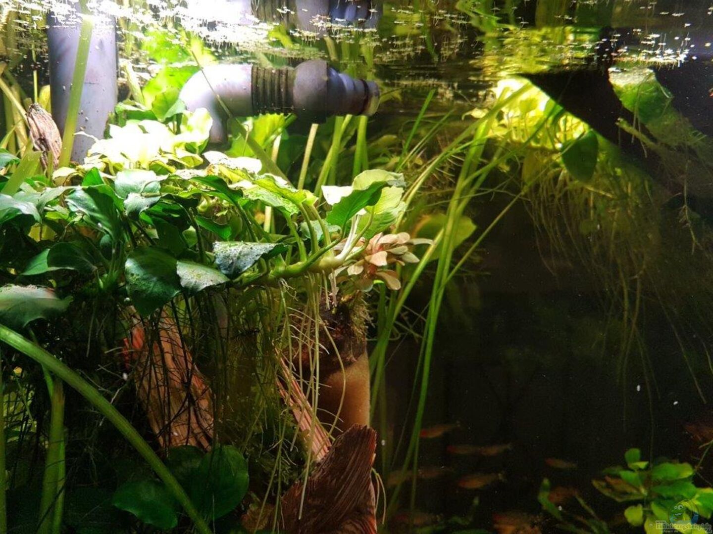 Die Zulaufrohre von den Filtern ins Aquarium sind dicht unter der Wasseroberfläche. Diese sind so eingestellt, dass, von oben gesehen, eine ovalförmige Strömung entsteht.