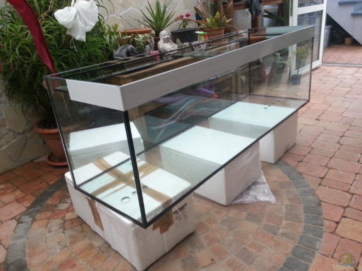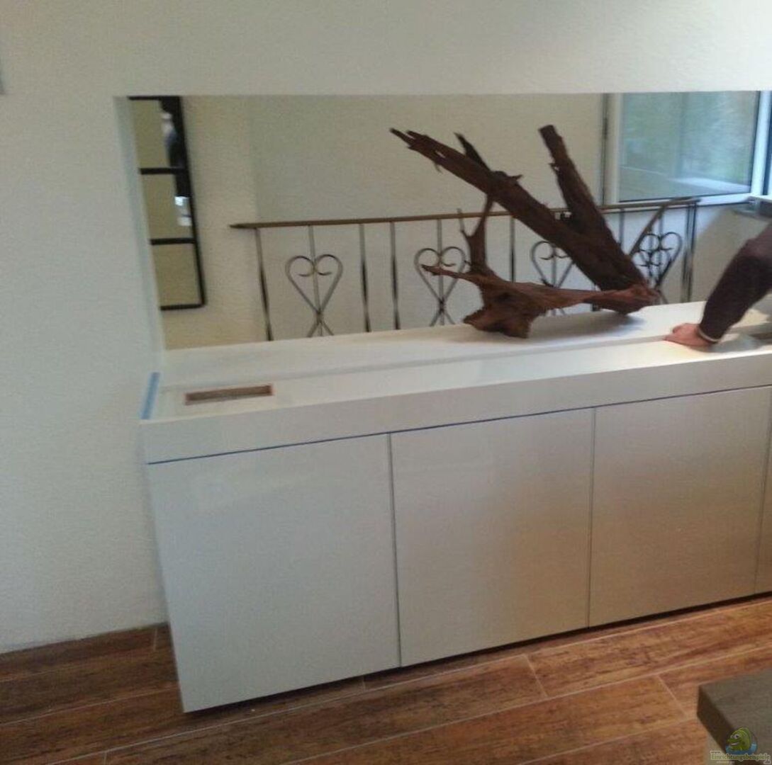 Das Aquarium liegt je zur Hälfte auf dem Unterschrank (Küchenseite) und dem Mauerdurchbruch auf.