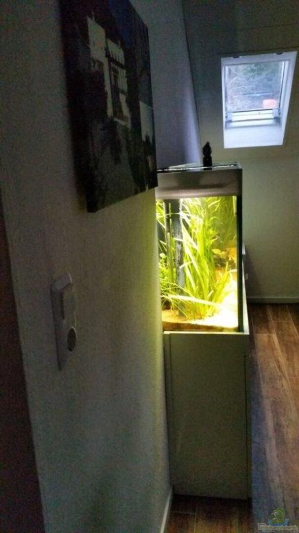 Auf der Treppenhausseite ist die Lücke zwischen Aquarium und Wand, wegen extremer Zugluft, mit PE-Schnur abgedichtet.