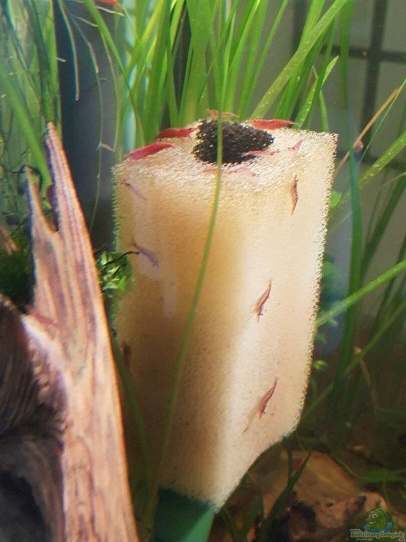 Die Einlassrohre zum Filter sind wegen der Garnelen mit Schaumstoffpatronen abgedeckt. Diese haben noch den Vorteil, sie leicht aus dem Aquarium entnehmen und auswaschen zu können.