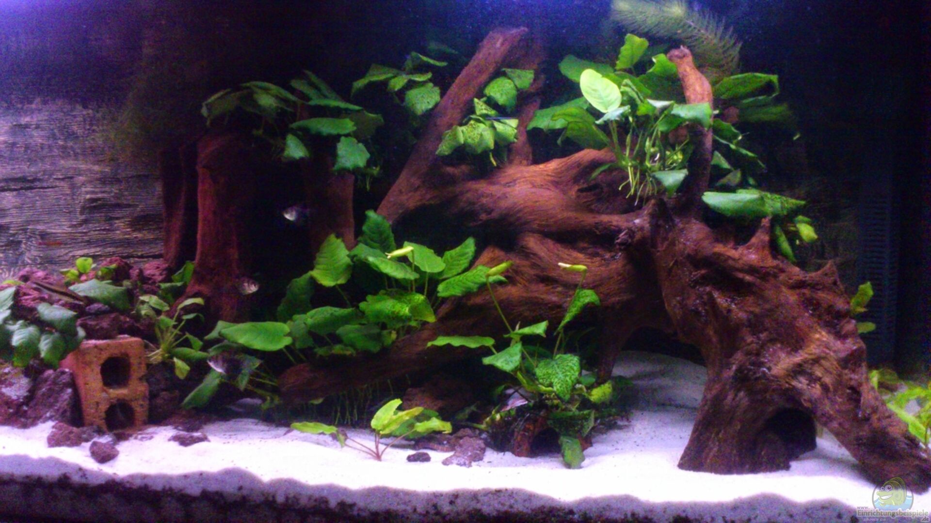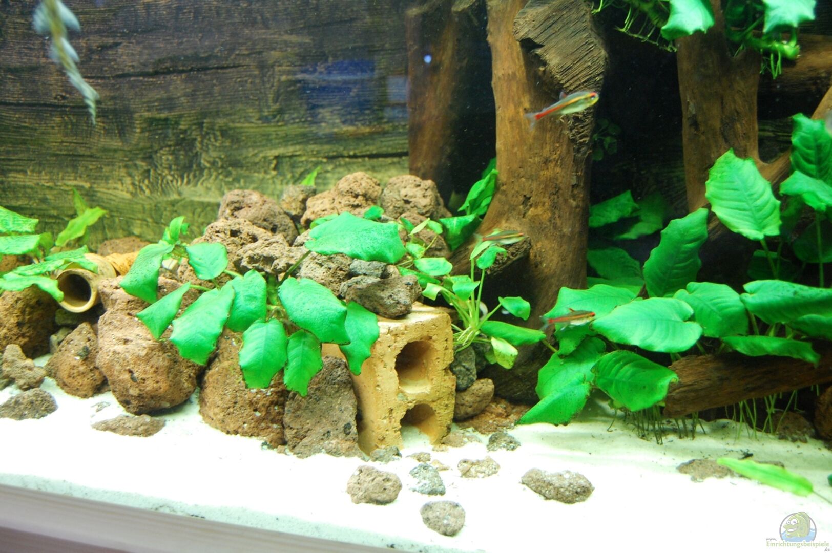 Zwergspeerblatt (Anubias barteri var. nana) auf der Wurzel und auf einigen Lavasteinen.