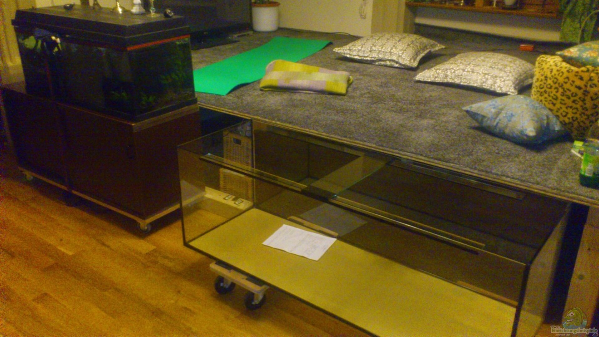 Mein altes Becken (100x40x40, 160 Liter) wurde plötzlich undicht. Also hatte ich erhöhten Ansporn den lange gehegten Traum eines grö??eren Beckens schnell umzusetzen. Den Platz dafür hatte ich bereits beim Einbau des Fussbodenpodestes im Winter 2013 in meinem Wohnzimmer vorgesehen.