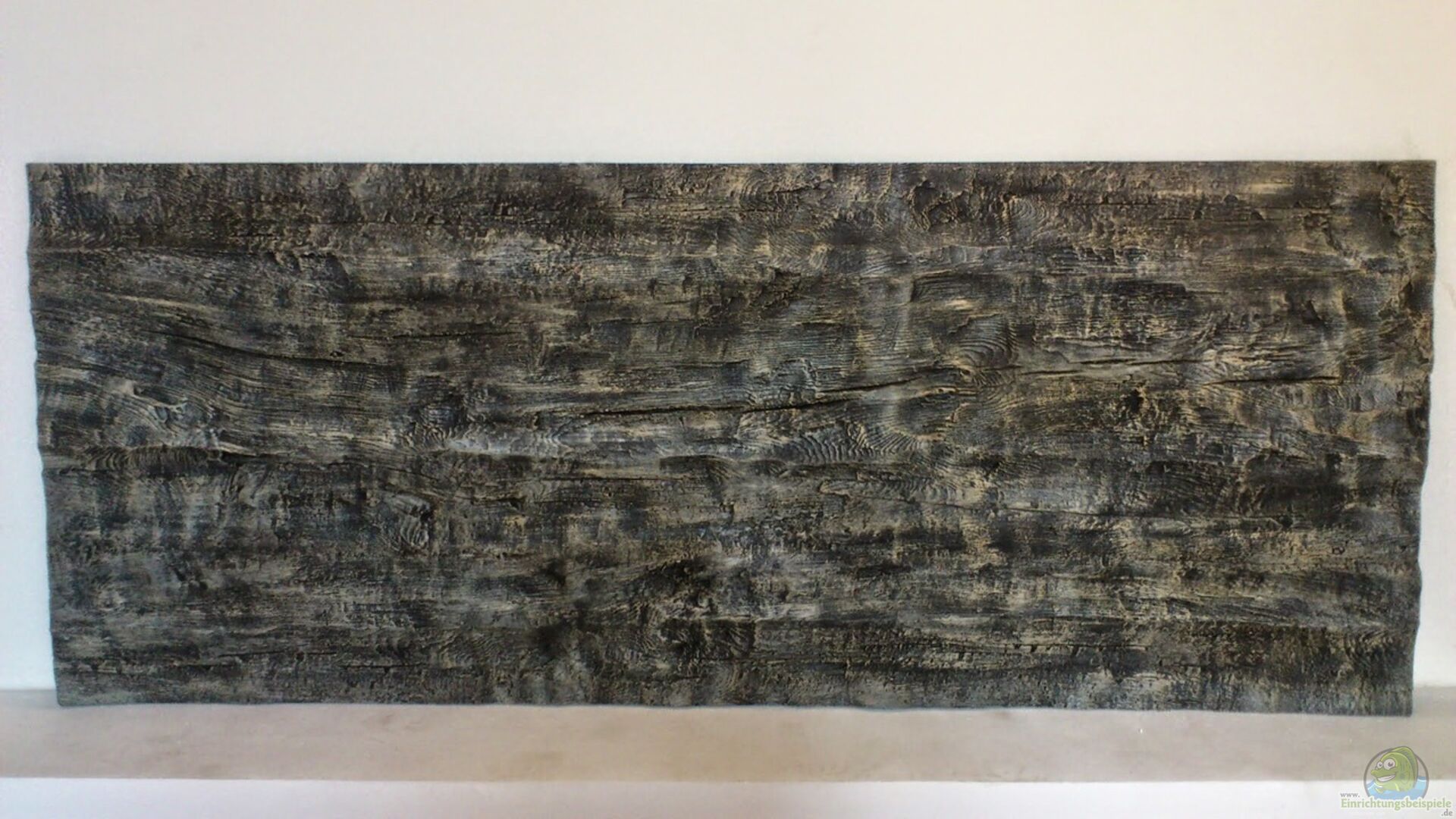 Struktur-Rückwand "Altes Holzbrett" von Steinzeit-Design 150cm x 60cm. Um sie in mein niedrigeres Becken einsetzen zu können habe ich einfach unten einen Streifen mit einer Feinsäge abgetrennt. Leider gab es mein gewünschtes Design nicht in einer 50 cm hohen Variante, aber das Anpassen war auch keine schwere Arbeit.