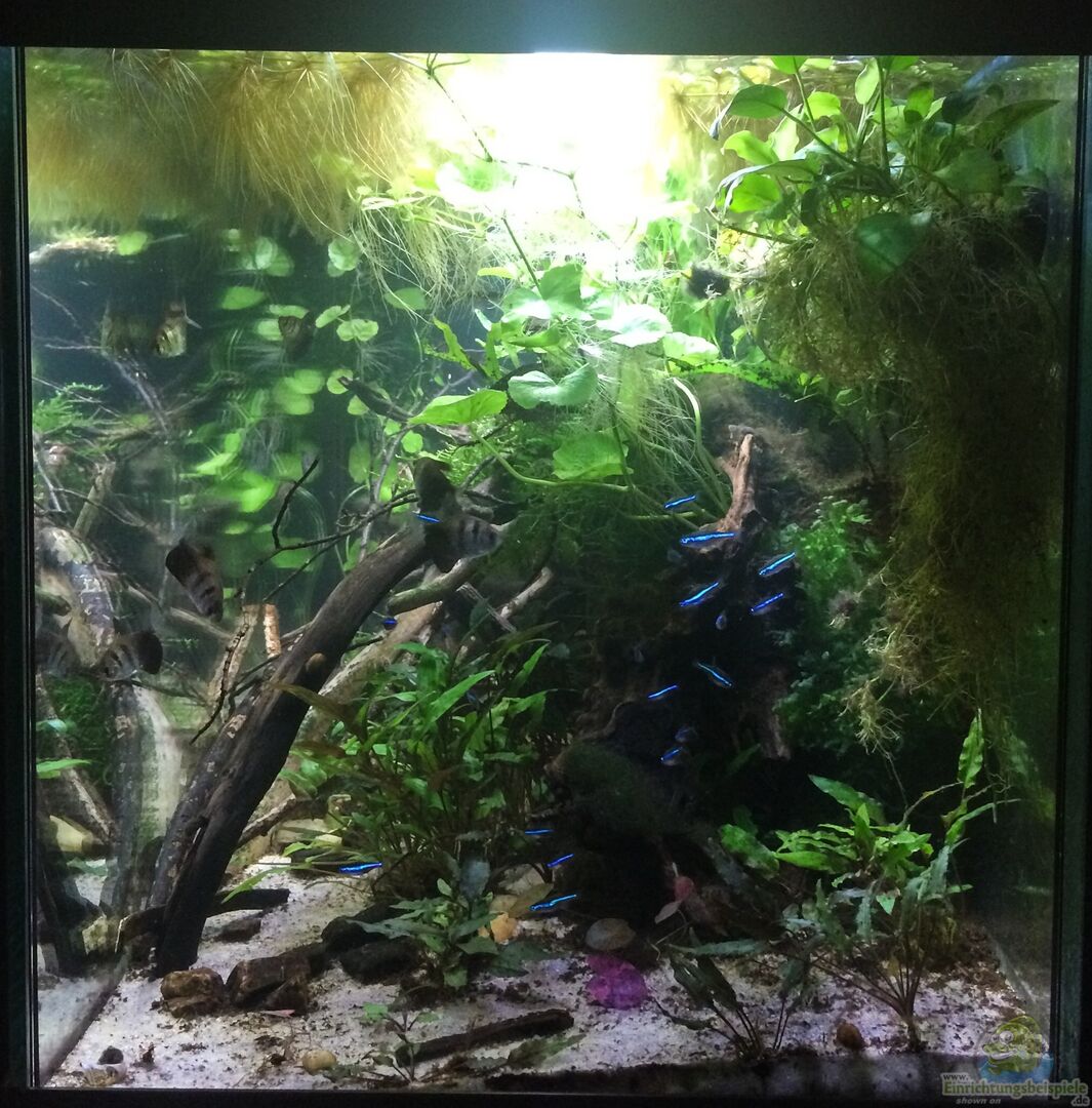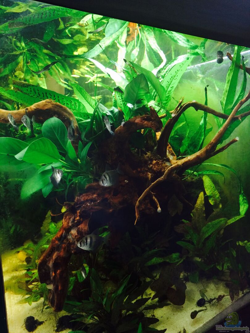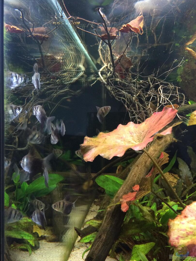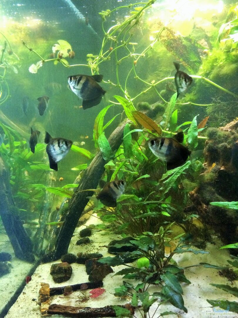 Anubia (verschiedene Sorten, auf aufgeschnittene Mooskugeln auf Tonröhren geklebt und mit Saugnäpfen an den Rückwänden befestig)