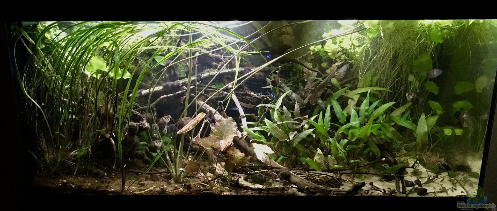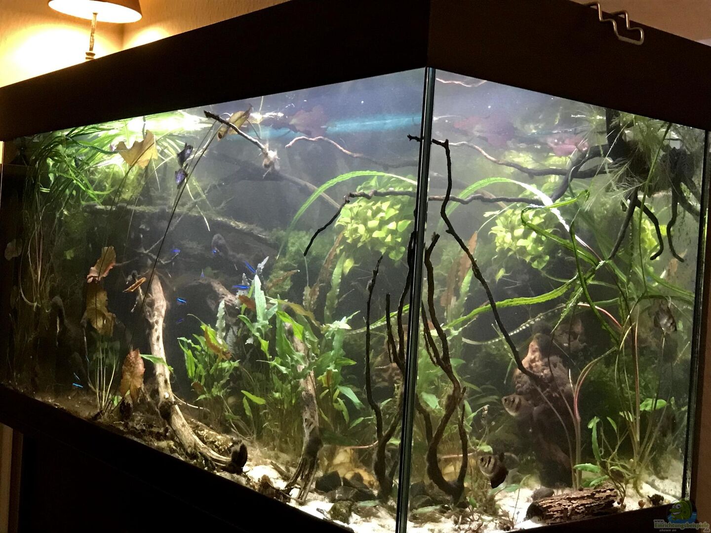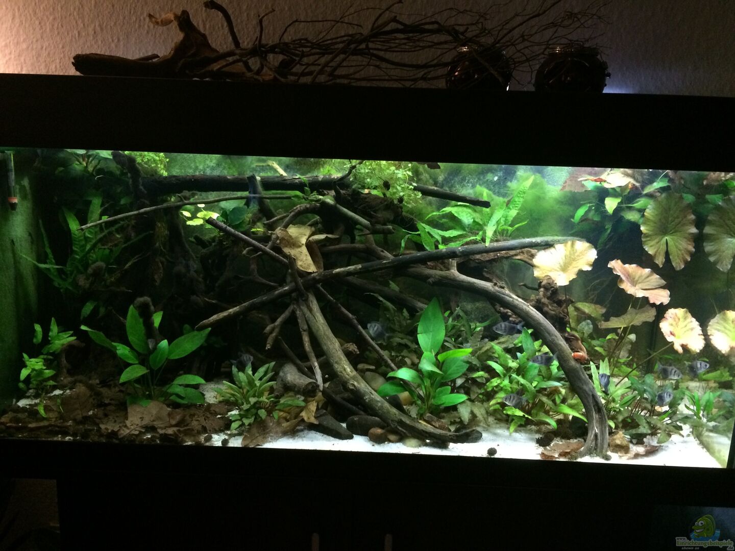 Anubia (verschiedene Sorten, auf aufgeschnittene Mooskugeln auf Tonröhren geklebt und mit Saugnäpfen an den Rückwänden befestig)