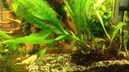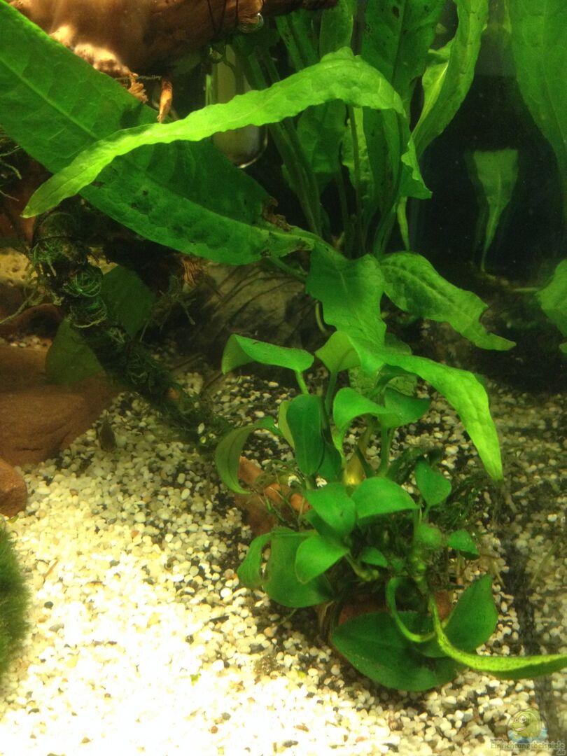 Anubias barteri var. nana , sie wächst langsam und kann deshalb von Algen befallen werden. Man kann sie mit Nylonschnur auf Wurzeln und Steinen fixieren, während sie anwächst. Beim Einpflanzen in den Bodengrund darf der Wurzelstock nicht bedeckt werden, da er sonst leicht fault.