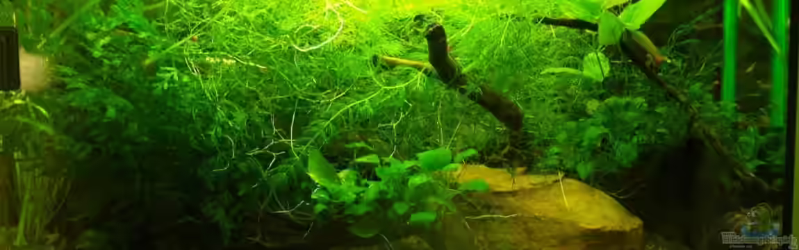 19.07.2013: Zwischenzeitlich hatte ich mit einem leichten Blaualgenbefall zu kämpfen. Betroffen waren die Filterschwämme und einige Schwimmpflanzen sowie Nix- und Hornkrauttriebe direkt unter der Oberfläche. Durch konsequente Entfernung befallener Pflanzenteile, Auskochen der Filterschwämme, kräftigem Animpfen aus einem gesunden Becken, moderater Pflanzendüngung und vorrübergehend verkürzter Beleuchtungszeit scheint das Problem behoben zu sein. Trotz der massiven Filterreinigung konnte kein Nitritanstieg gemessen werden.