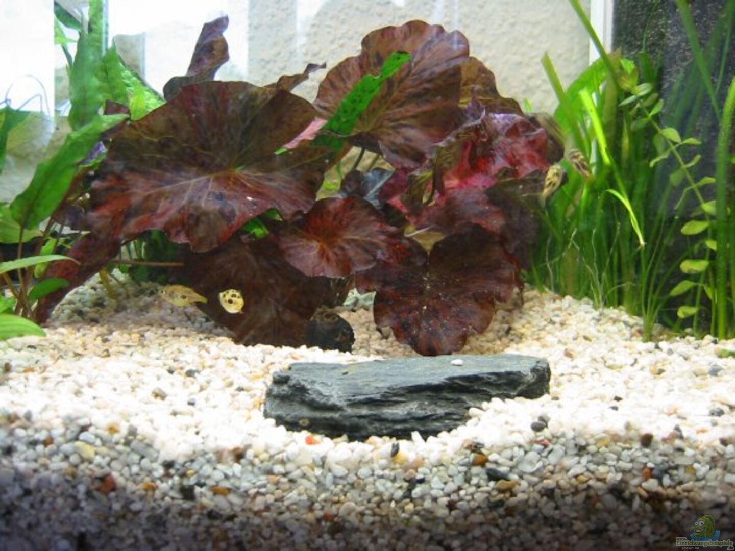 Futter geht immer auf der Schieferplatte im Vordergrund nieder. Ansonsten gibt es noch hinten Verstecke in Form von Moorkienholz, und Tonhöhlen die hinten zwischen den Pflanzen im Kies eingegraben sind.