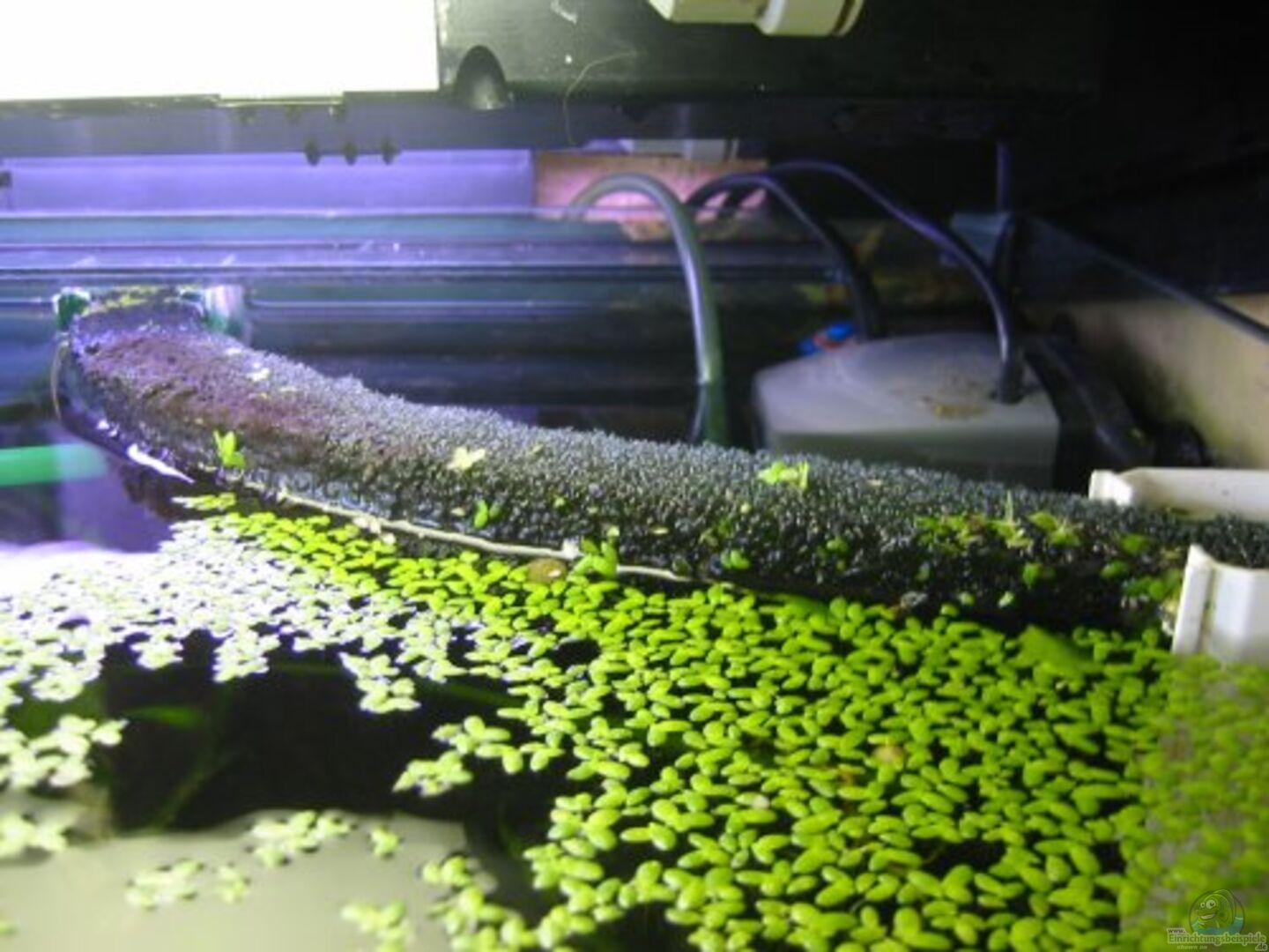 Oft gibt es im Schneckenzuchtbecken Gemüse auf das sich dann die Schnecken stürzen. Z.B. einen Brokoli-Strunk. Zum Absammeln der Schnecken und Füttern der Kugelfische nehme ich dann den Brokoli mitsamt der Schnecken nach einigen Minuten raus und gebe ihn ins Kugelfischbecken. Erst fressen die Kugelfische die Schnecken ab, dann machen sich die Welse über das Grünzeug her.
