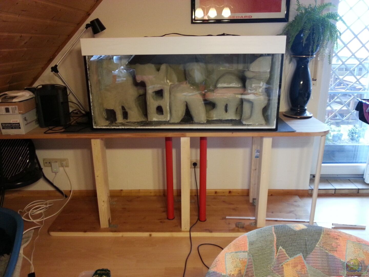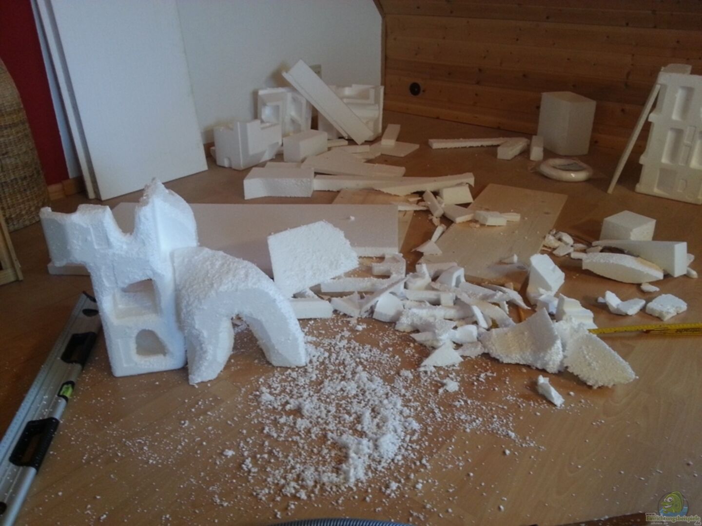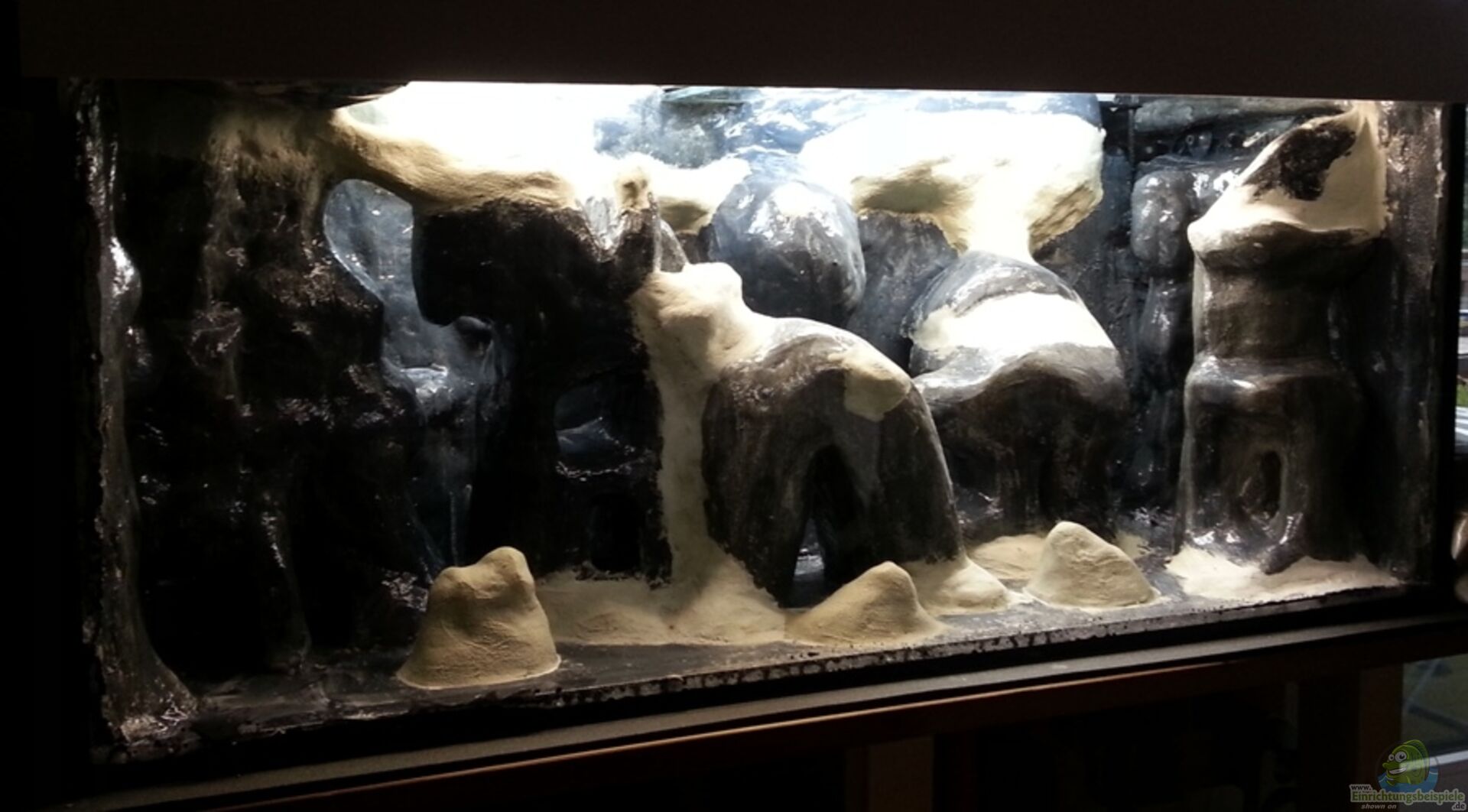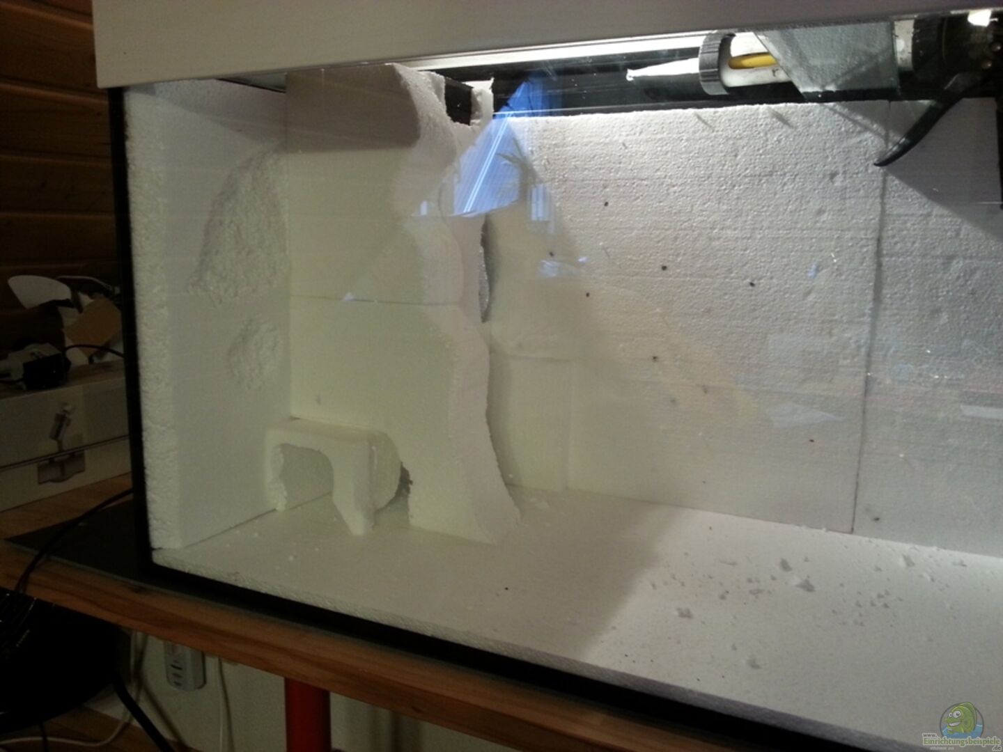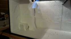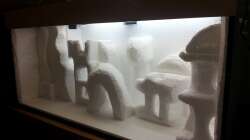 Habe angefangen das Becken einzurichten, Rückwand und Aufbauten sind komplett aus Styropor ( nach beim anpassen ) und habe ich komplett selber gebaut werden noch mit Fliesenkleber beschichtet. Dann noch min. zwei Schichten Epoxidharz in dunkelgrau und schwarz beschichtet.
