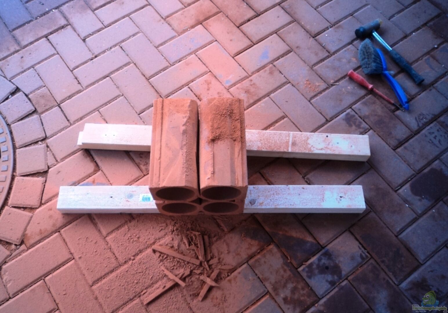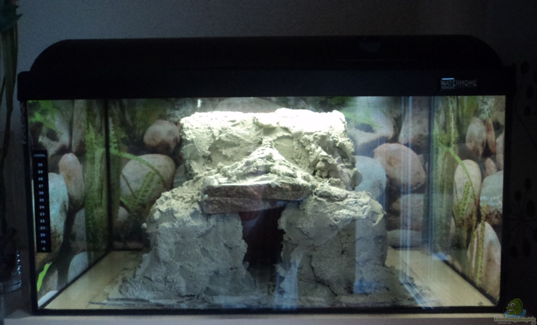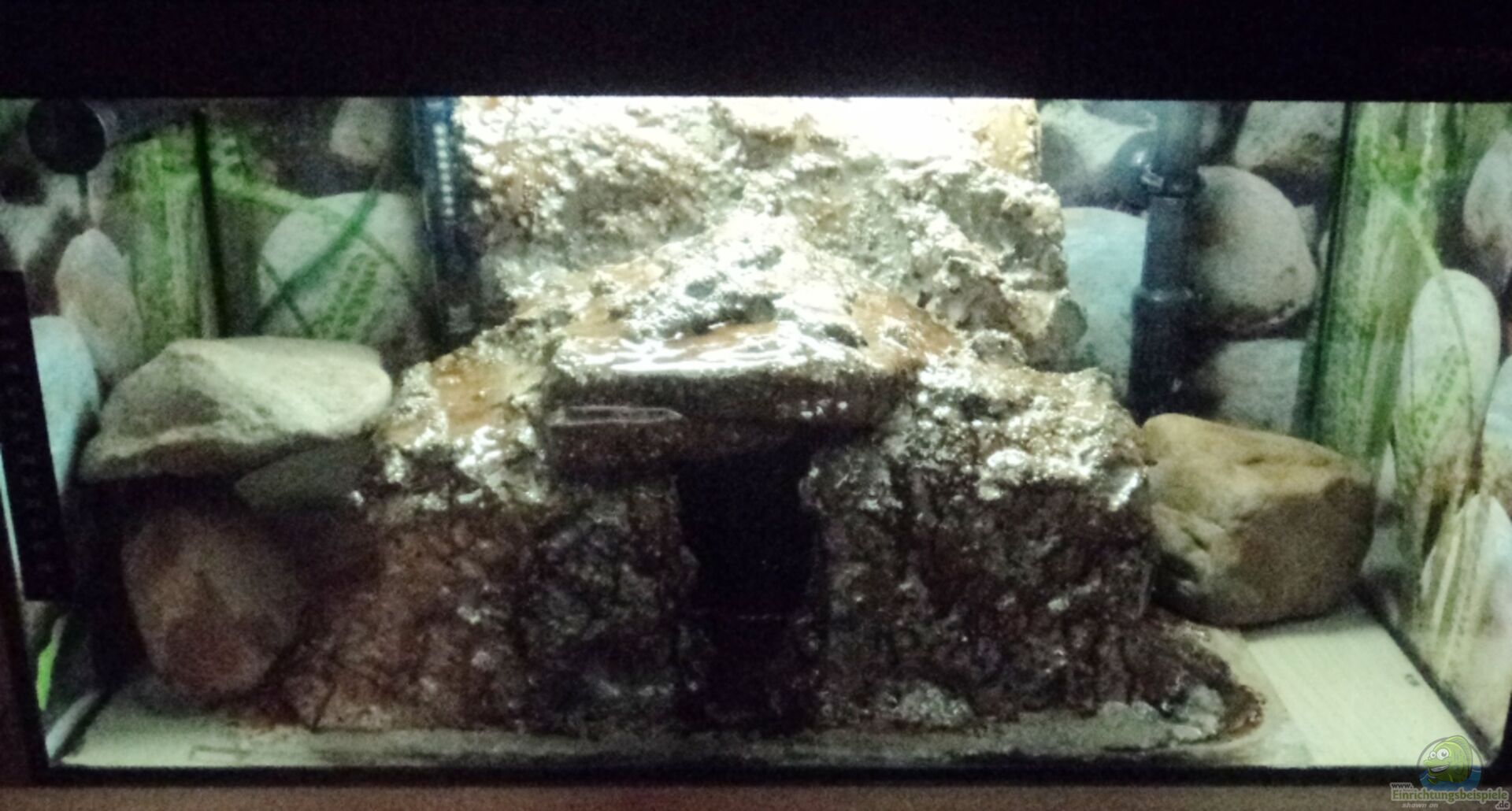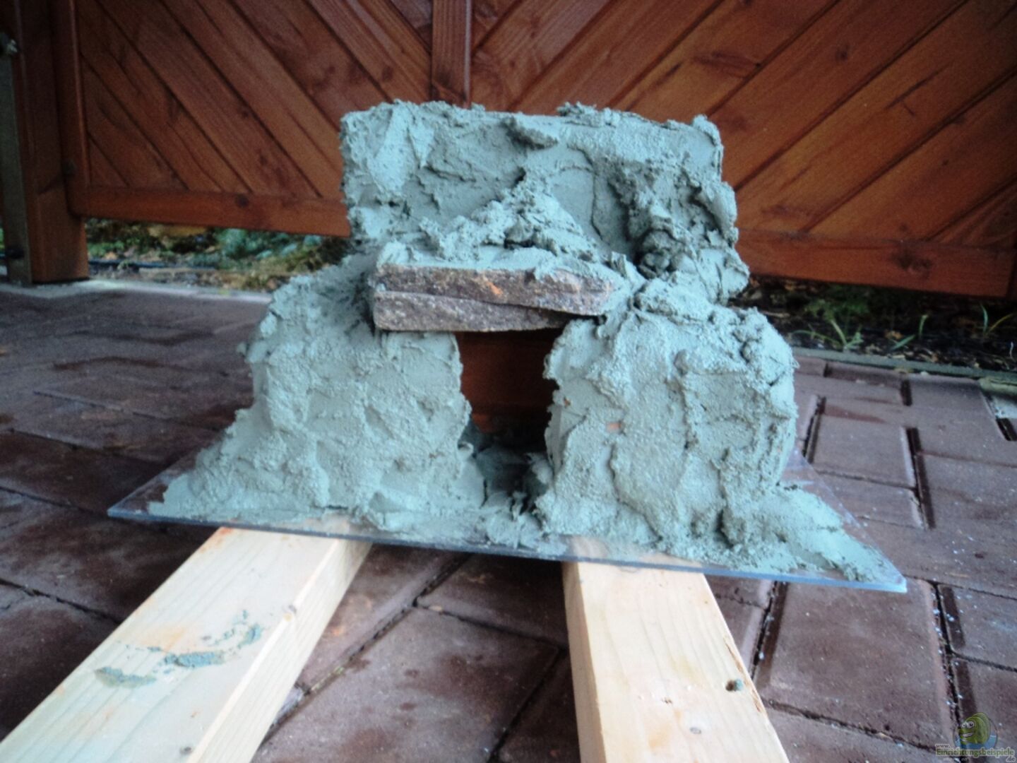 Der Felsen (Röhren) ist auf einer 0, 7 mm Plexiglas-Platte verklebt. So kann ich den Felsen problemlos aus dem Becken nehmen. Die Röhren sind von innen auch mit Epoxidharz versiegelt damit keine scharfen Kanten entstehen wo sich die Jungen verletzten könnten.