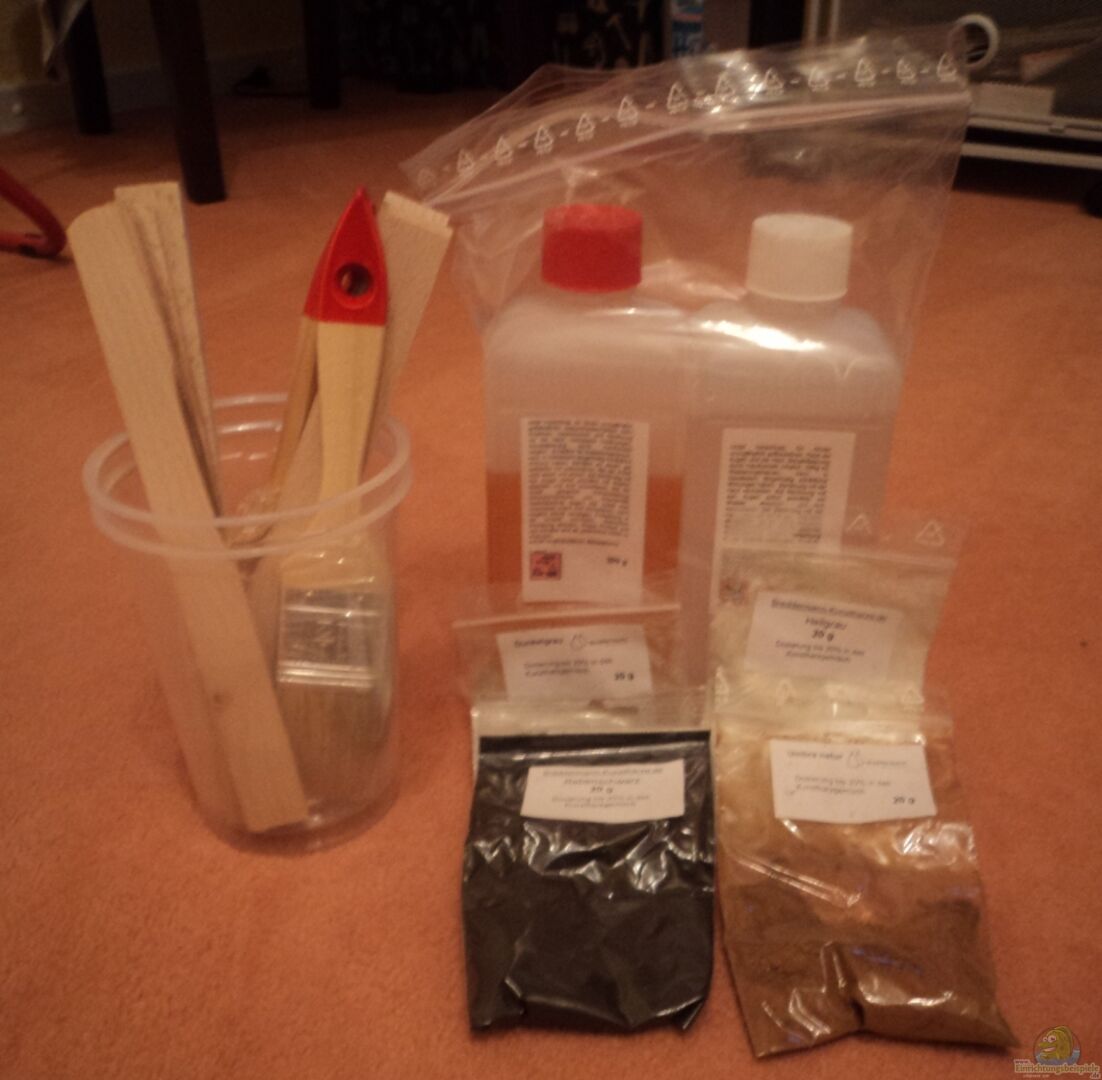 Den Felsen mit zwei Schichten Epoxidharz überzogen, erst mit grau und dann in dunkelbraun (sieht auf den Fotos heller aus als es in Wirklichkeit ist).
