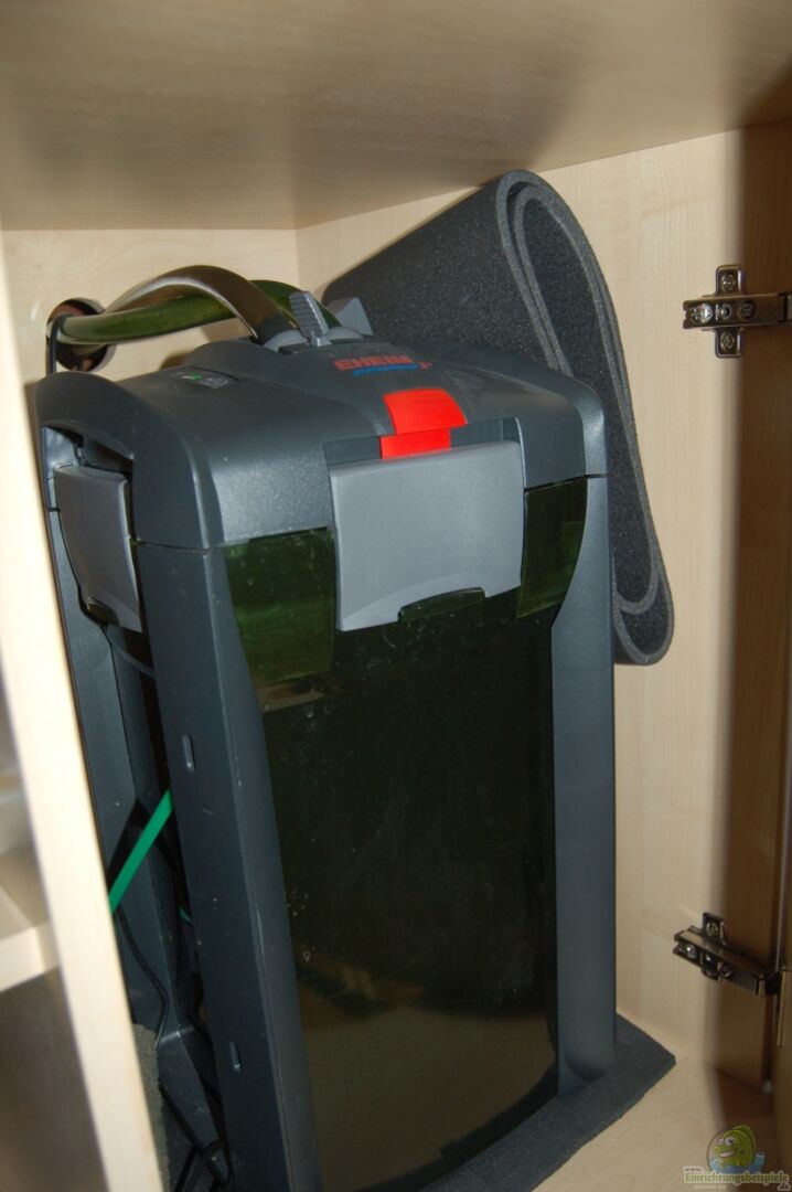 Zwischen Schrank und Aquarium befindet sich eine Isomatte zum halten der Temperatur und zum Schutz des Schranks.