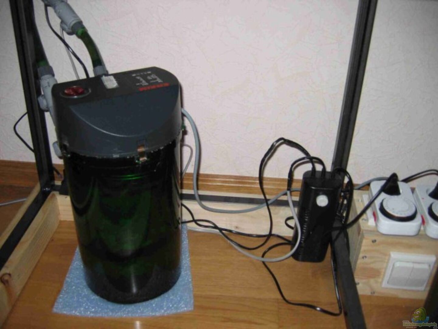 Als Filter verwende ich einmal einen Eheim 2317 mit 1000l/h, gefüllt mit Schaumstoff, Zeolith, Biomax, und Filterwatte, und einen Eheim 2252 Innenfilter mit 1200 l/h bestückt mit 2 Schaumstoffpatronen und eine Patrone gefüllt mit Watte