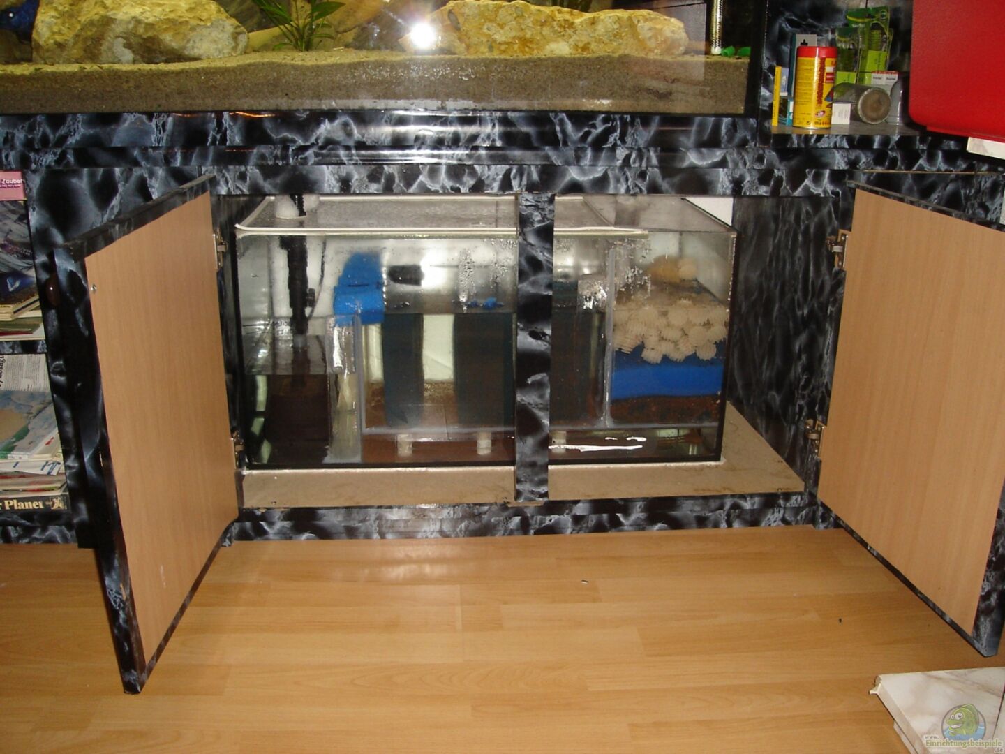 - Rückraum der Rückwand wird als Biofilter genutzt, der durch eine 200 Strömungspumpe angetrieben wird. Als Filtermaterial dienen Filterschaumwürfel von der Grö??e 2, 5x2, 5cm.