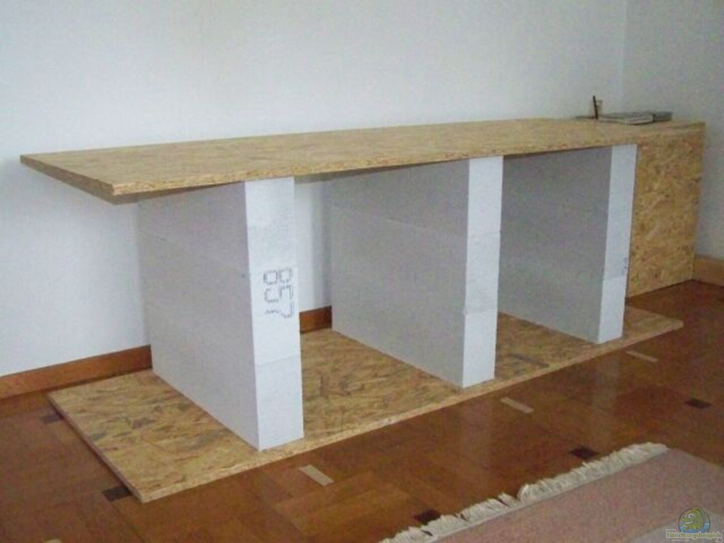 -OSB Unterbau selbstgebaut mit Ytong und OSB-18mm-Platten und Möbelbau Stützen.