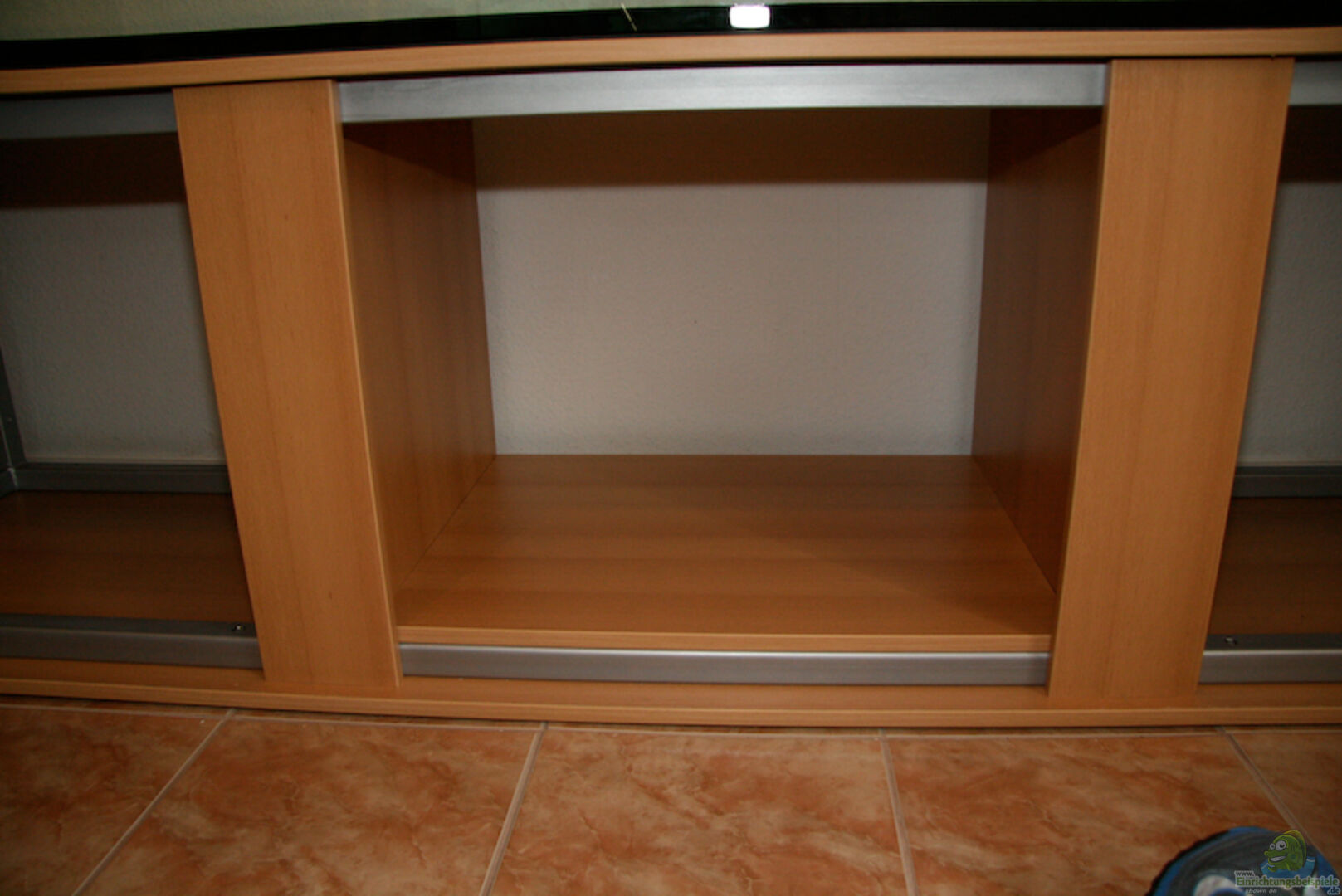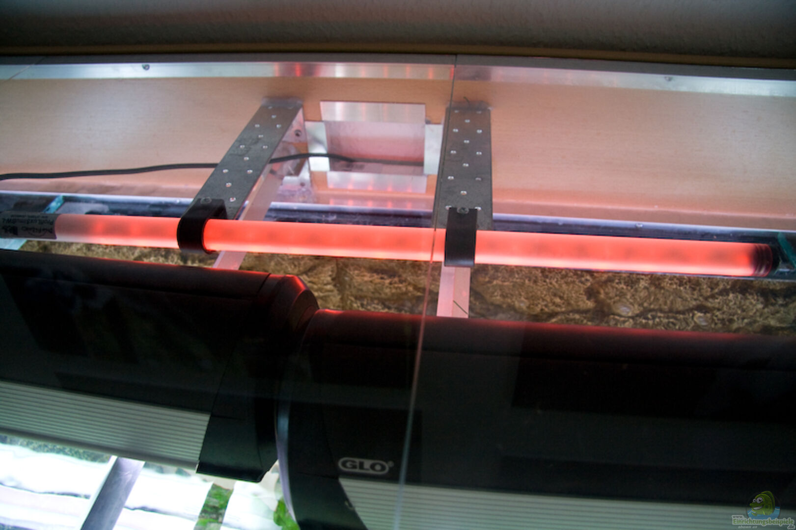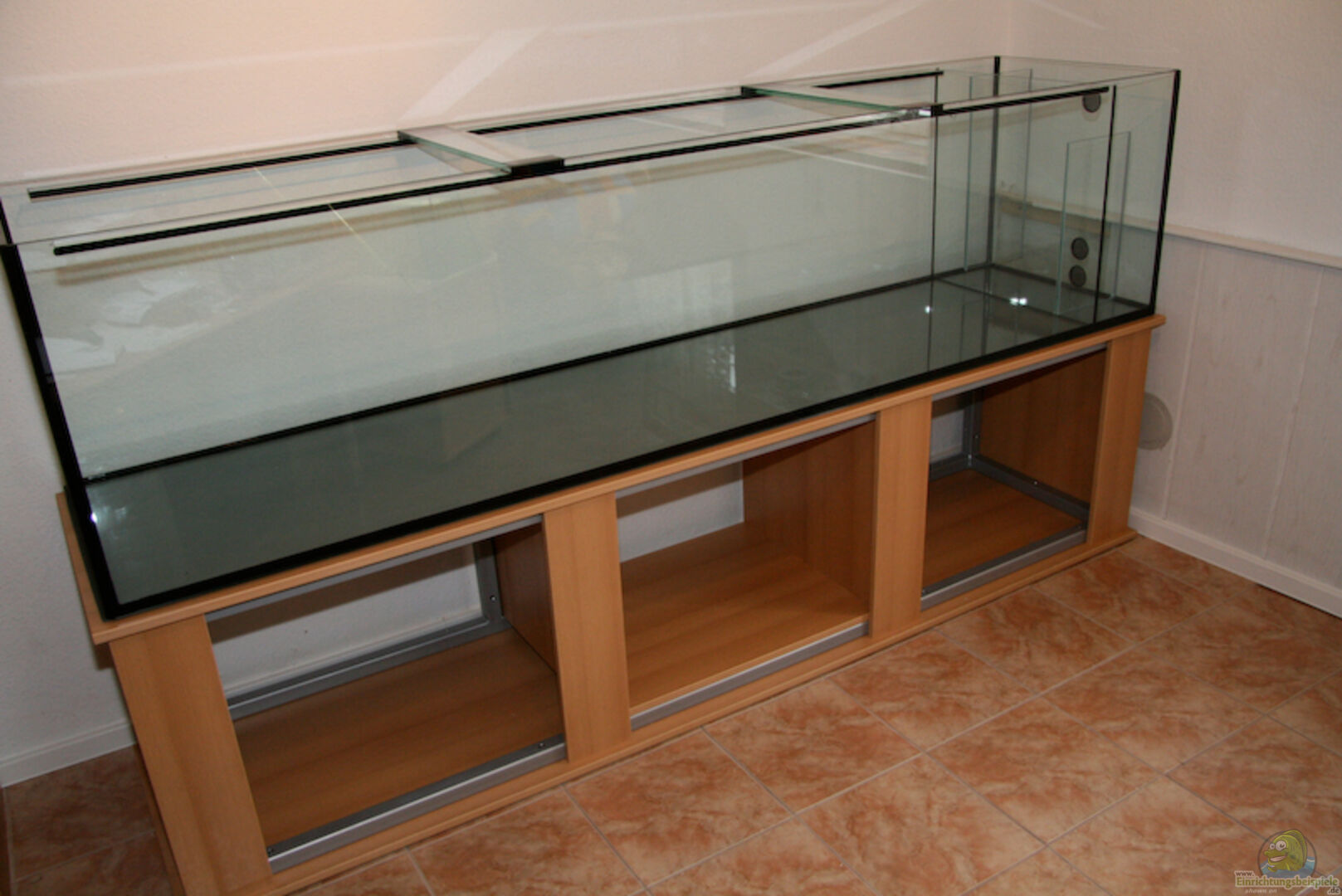 Schrank, Abdeckung, Beleuchtung alles selbst gebaut. In Abdeckung Zu & Ablauf für Wasserwechsel (Anschlussstutzen für Pumpe zum Ablaufen und Gartenschlauch für Frischwasser)