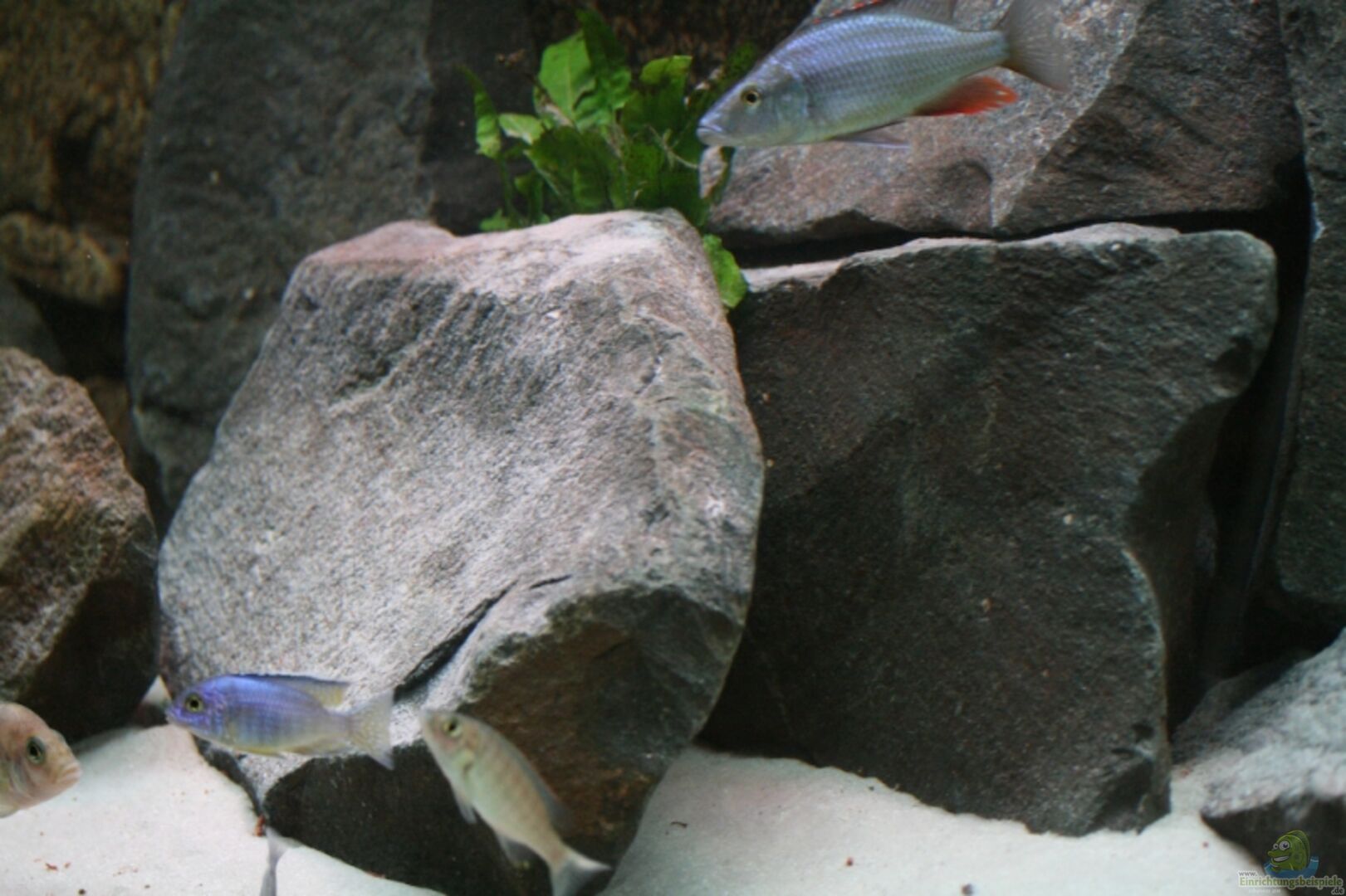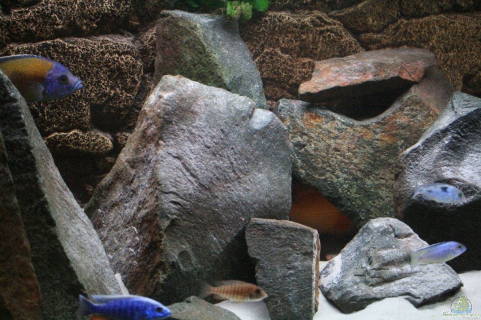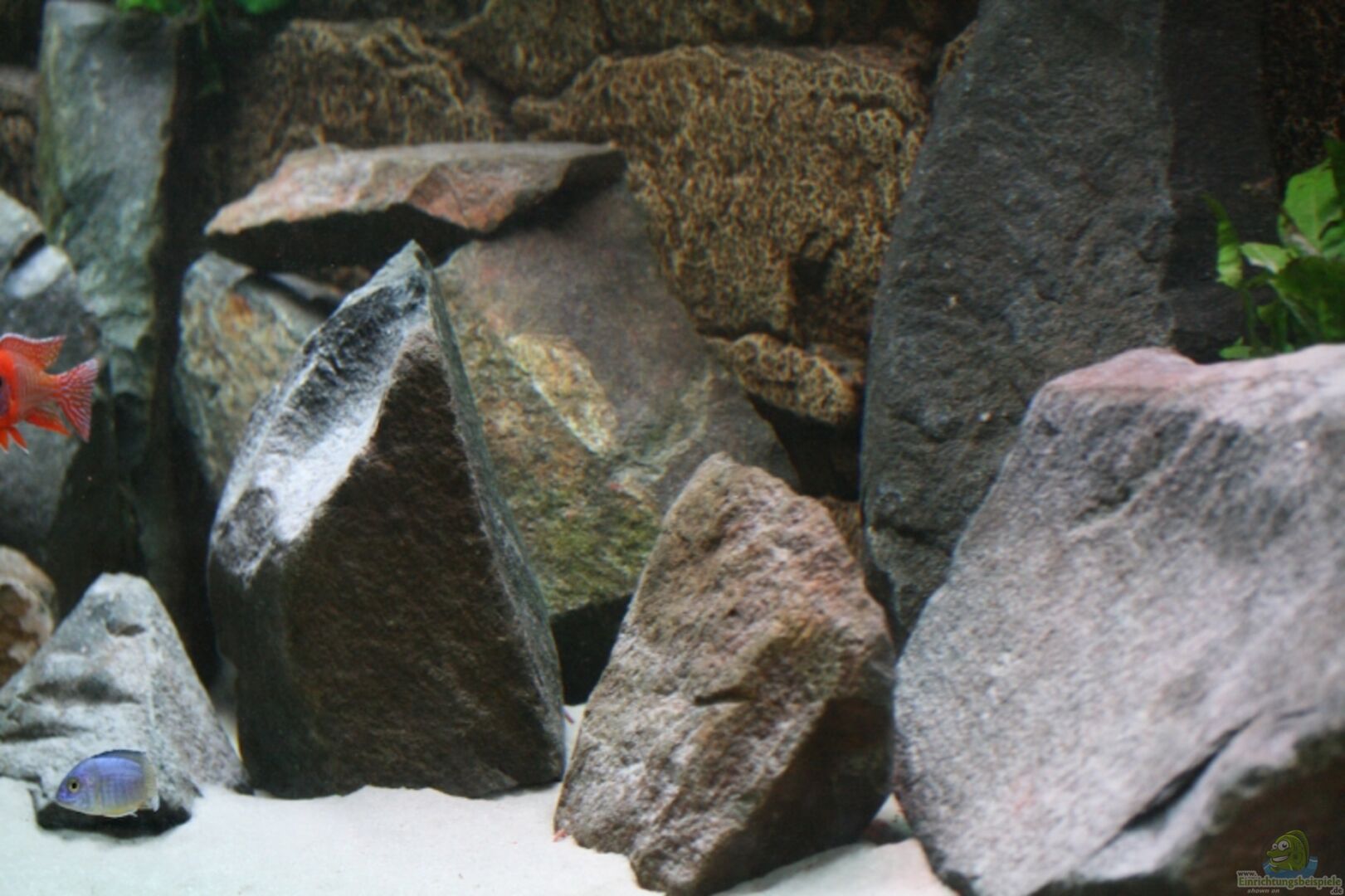Ca. 350 KG grosse Felsbrocken aus einem Bach bei uns in der Nähe. Das kommt dem Malavisee glaube ich recht nahe, die Fische lieben die Felslandschaft, Sie schwimmen wesentliche agiler und mehr hin und her als vorher. Zwichen den Felese sind jede Menge Höhlen und Ritzen wo sich die Fische zurückziehen könnnen. Die Steine stehen auf 2 cm starken Styproporplatten.