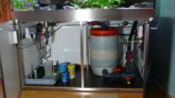 Steter Wasserzulauf, ca. 200 L in der Woche, geregelt über ein Edelstahl Feinnadelventil. Heizstab 300 W, geregelt über ein elektronisches Temperatur Mess- und Regelgerät. ( Heizstab sehr selten an, da hinter dem Aquarium ein Heizkörper der Zentralheizung hängt ) Entlerungsventil für Vorfilterkammer zur leichteren Reinigung, Absperr- und Entlerungsventile zum Ausbau des Filtertopfes und der Rückförderpumpe.