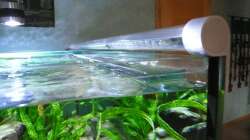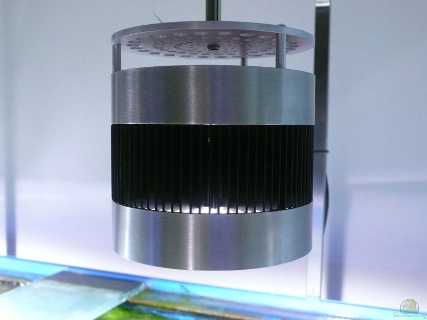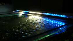 Hauptlicht: 2x 50 W High Power LED- 9000 K ( Eigenbau ). Abendlicht : 2 LED Strips 5, 7 W weiss, Nachtlicht 3 blaue LED Strips 4, 1 W in 30 mm Plexiglasrohr vom vorderen oberen Beckenrand nach schräg hinten.