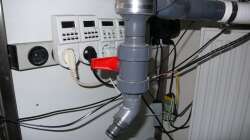 Eingeklebte Vorfilterkammer mit groben Filterschwamm. 60 L Filtertopf befüllt mit Filterschwamm - oben grob, unten fein, in der Mitte 20 L Sinterkeramikröhrchen. Rückförderung ins Becken mit einer ATK 5536 Pumpe, ca. 90 L/Min.
