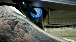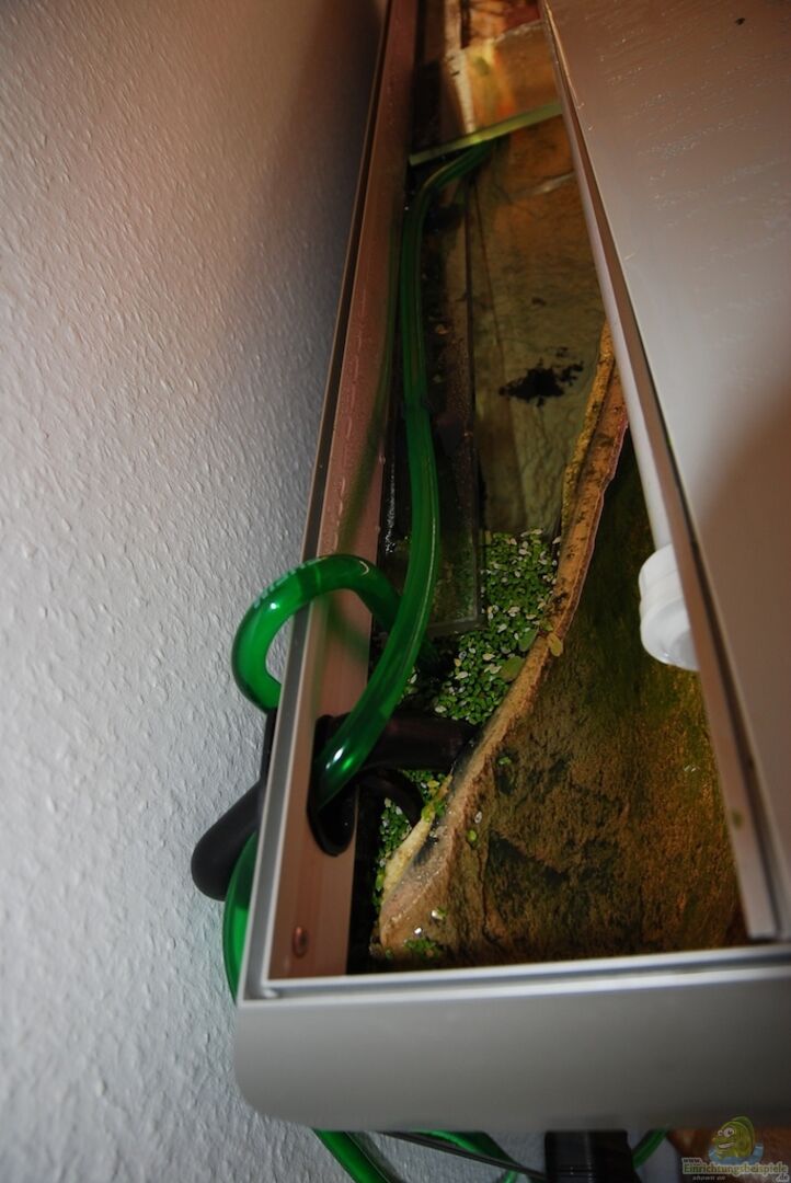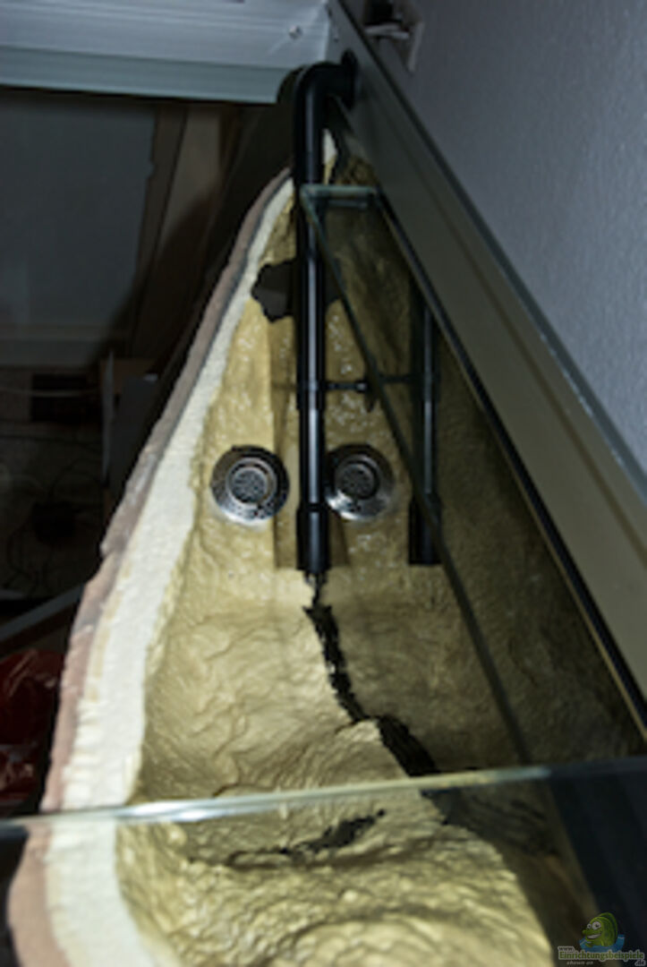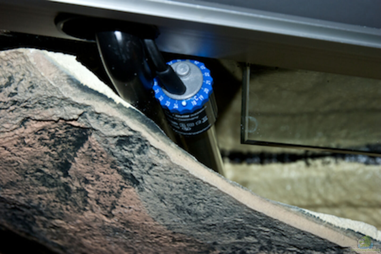 Felsenmodel H von Back to Nature um die Technik zu verstecken (Ansaugrohr des Filters und Heizstab). Der Felsen ist nicht vollständig mit Silikon abgedichtet, so dass Wasser zwischen Felsen und Glas hindurchströmt. der felsen ist beschwimmbar und bietet zusätzlichen schutz für schwache tiere