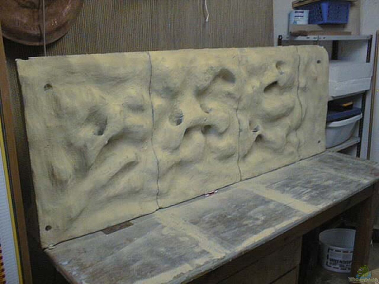 selbstgebaute rückwand mit vielen höhlen aus styropor , fliesenmörtel , sand und kunstharzversiegelung