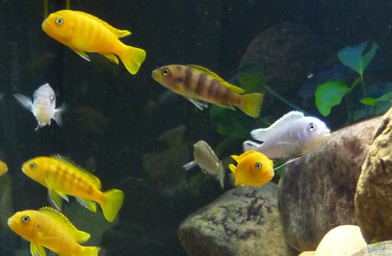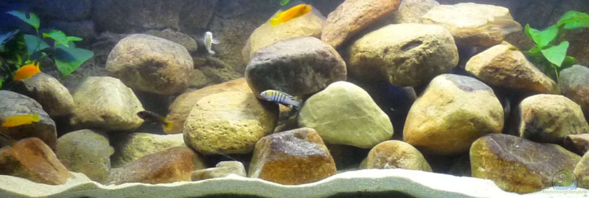 Die Rückwand wurde inzwischen entfernt, da sich immer wieder Fische hinter derselbigen verirrten. D.h. der Biofilter entfällt und wird nun mit einem Fluval 405, der immerhin 1300l/h umwälzt ersetzt. Die Felsaufbauten sind jetzt so in der Mitte des Beckens angeordnet, dass die Fische nun viel mehr Schwimmraum haben und sogar von beiden Seiten Höhlen besetzen können und im Endeffekt mehr Rückzugsmöglichkeiten haben.