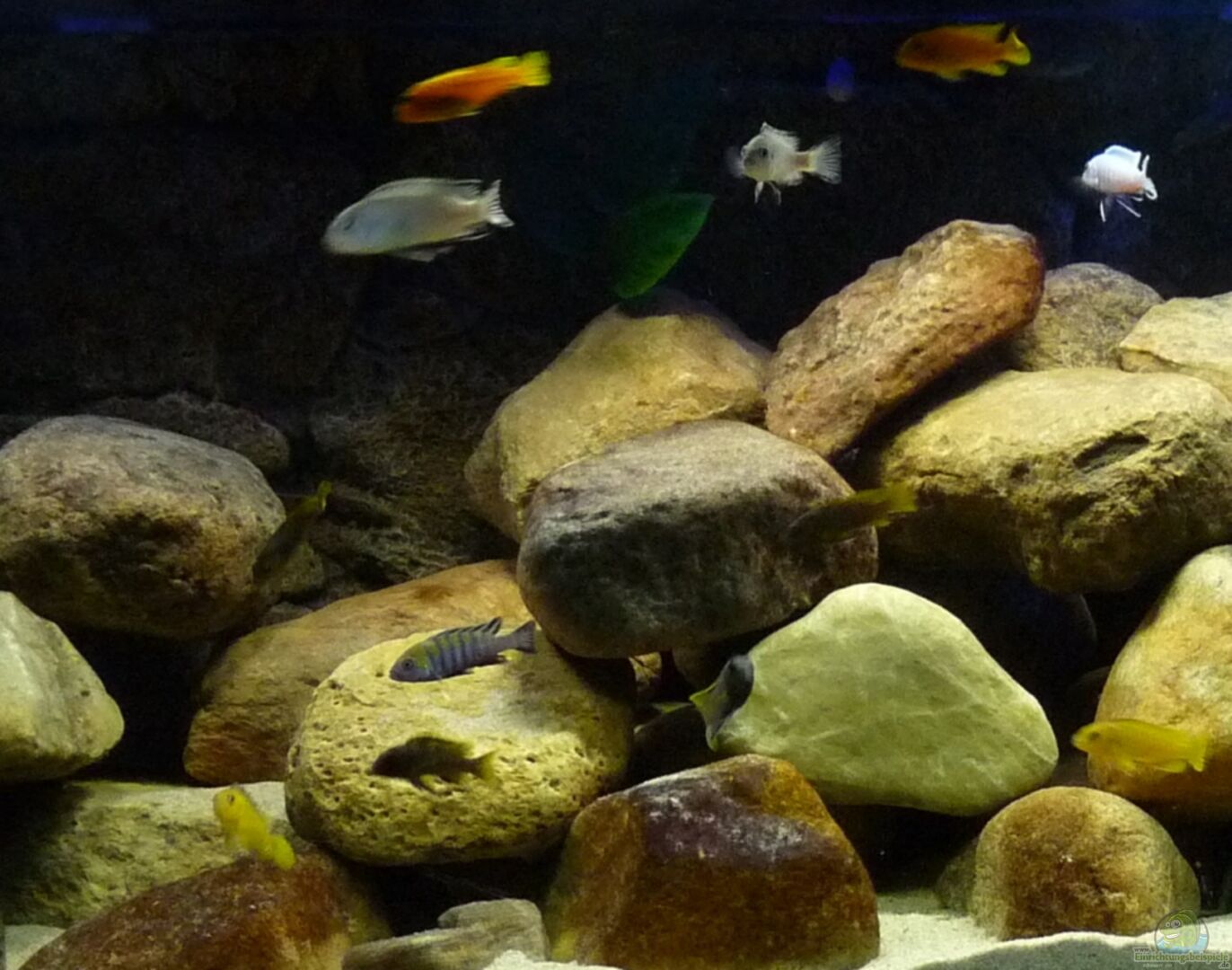 15.08.09- da ich (und offensichtlich auch die Fische) ;) nicht 100% zufrieden war, habe ich das Becken nochmals komplett ausgeräumt und neu gestaltet. Es wurden ca. 120Kg (nur grö??ere Steine ab 20-25cm) Feldsteine eingebaut, diese farblich passend zur Rückwand! Das Litoral ist jetzt höher aufgebaut, somit ergeben sich noch mehr Versteckmöglichkeiten! Die Mbunas danken es mir! :-)