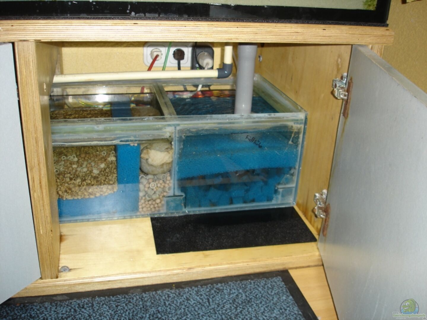 4-Kammer Filterbecken 100 Liter bestückt mit Syporax und blauen Filtermatten, Rieselschacht bestückt mit Biobällenund Filterwürfel, Eheim 1050 Kreiselpumpe zur Wasserbeförderung. Guter Strömungseffekt weil die Pumpe so stark ist