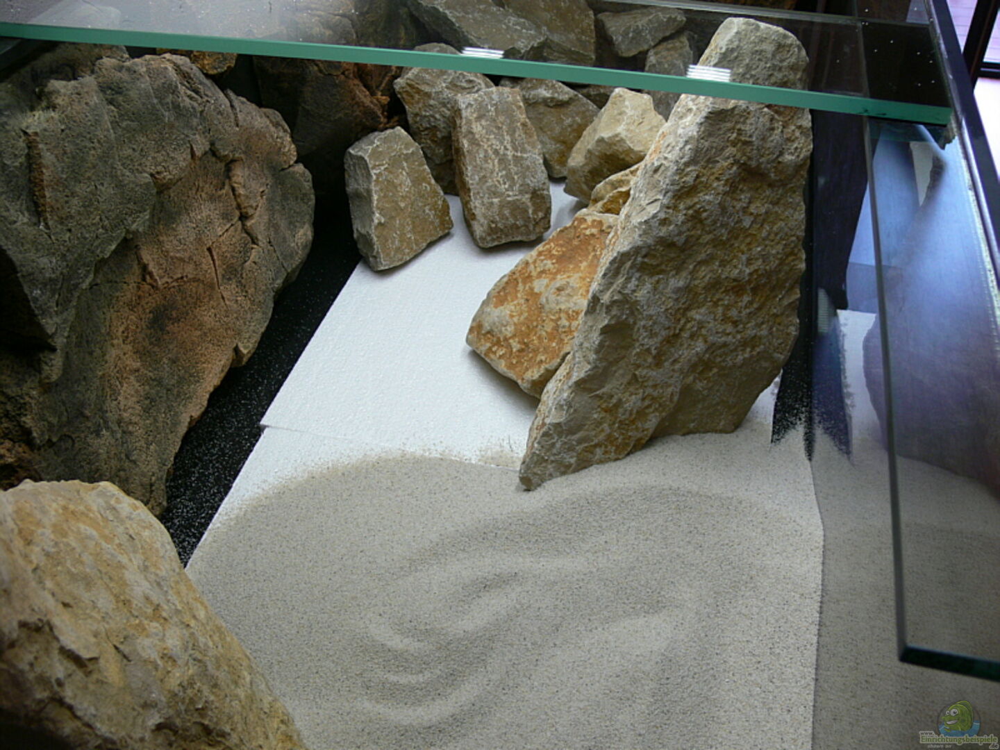 Ausserdem ist das Becken um die Steine herum mit 2cm dicken Styroporplatten zum Schutz der Bodenscheiben ausgelegt worden. Somit ist gewährleistet, dass die Steine nicht zu sehr auf das Glas drücken oder wenn sich mal ein Stein lösen sollte und auf die Bodenplatte fällt.