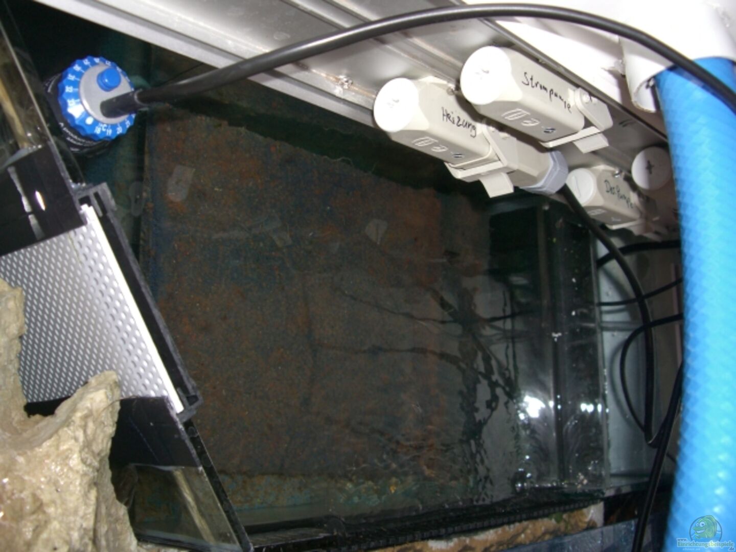 Im Becken ist ein 3Kammer-Filter eingeklebt (60x23x65cm). Als Filter sind Schichten aus 1. Filterwatte, 2. Filterschwamm grob, 3. Lavagestein (klein) im Netz, 4. Filterschwamm grob 5. Efisubstrat im Netz und 6. Filterschwamm gro?? verwendet worden. Die Ansaugkammer, ist mittels eines Schiebers, regulierbar was den Wasserdurchfluss betrifft. An der Oberseite der Ansaugkammer ist ein Oberflächenablauf eingebaut worden.