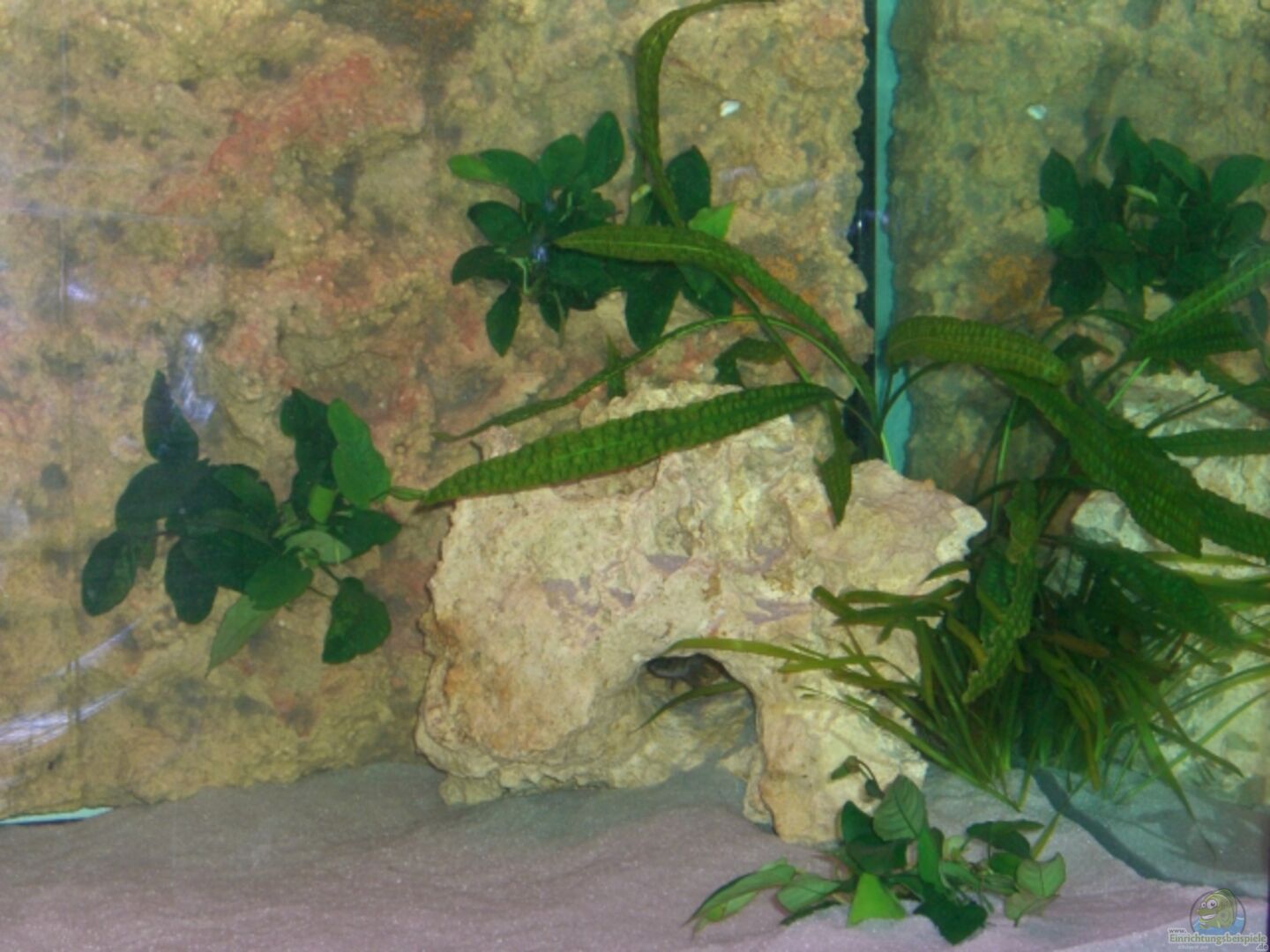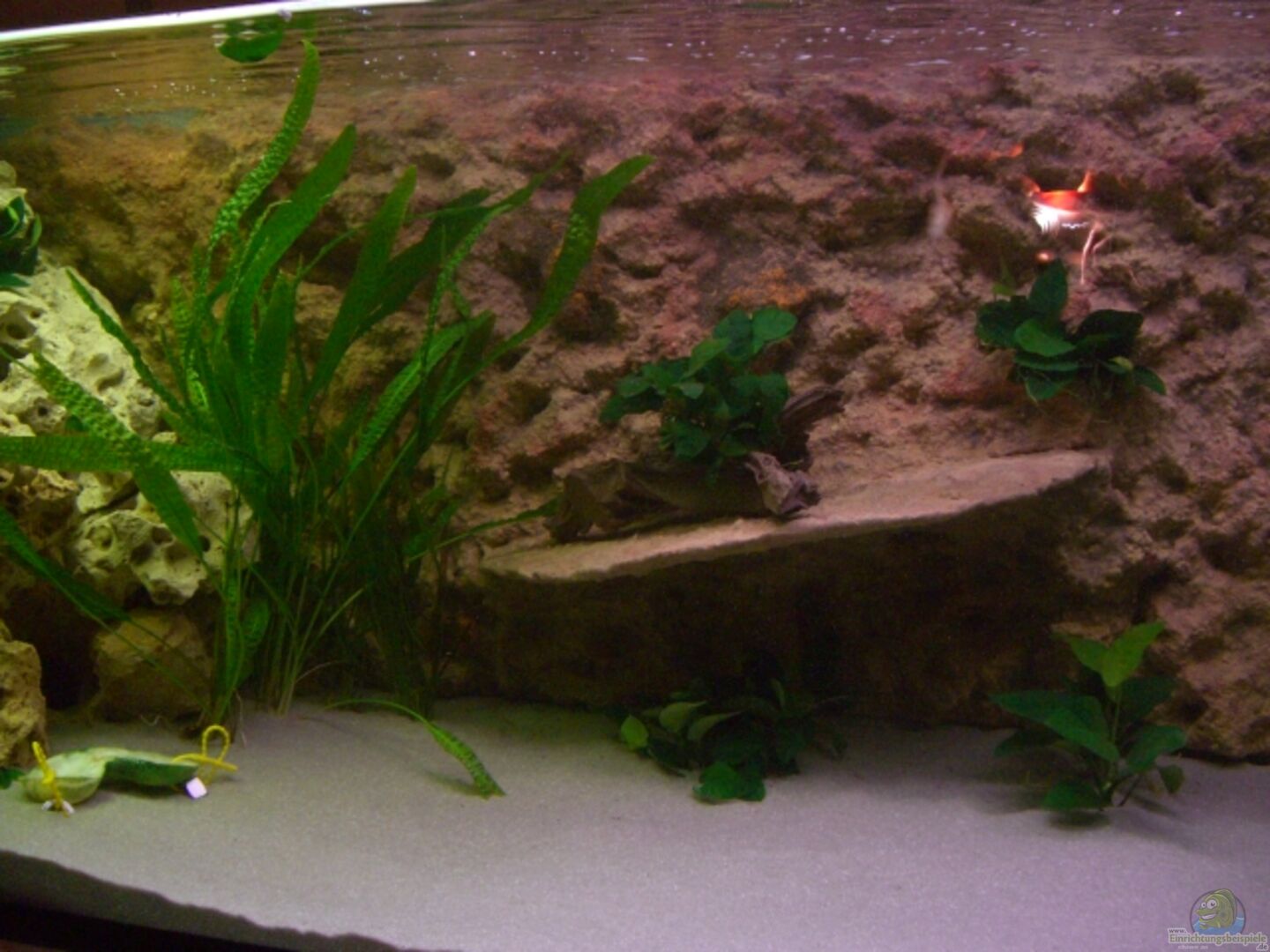 Das Becken wurde für mich so gebaut. Der Unterbau, die Abdeckung, die Beleuchtung und die Rückwand sind Marke Eigenbau. Im Becken wurde vom AQbauer ein 3Kammer-Filter eingeklebt, der mir als Hauptfilter dient. Für den Wasserwechsel habe ich mir ein Zu- und Ablauf in die Abdeckung gelegt.