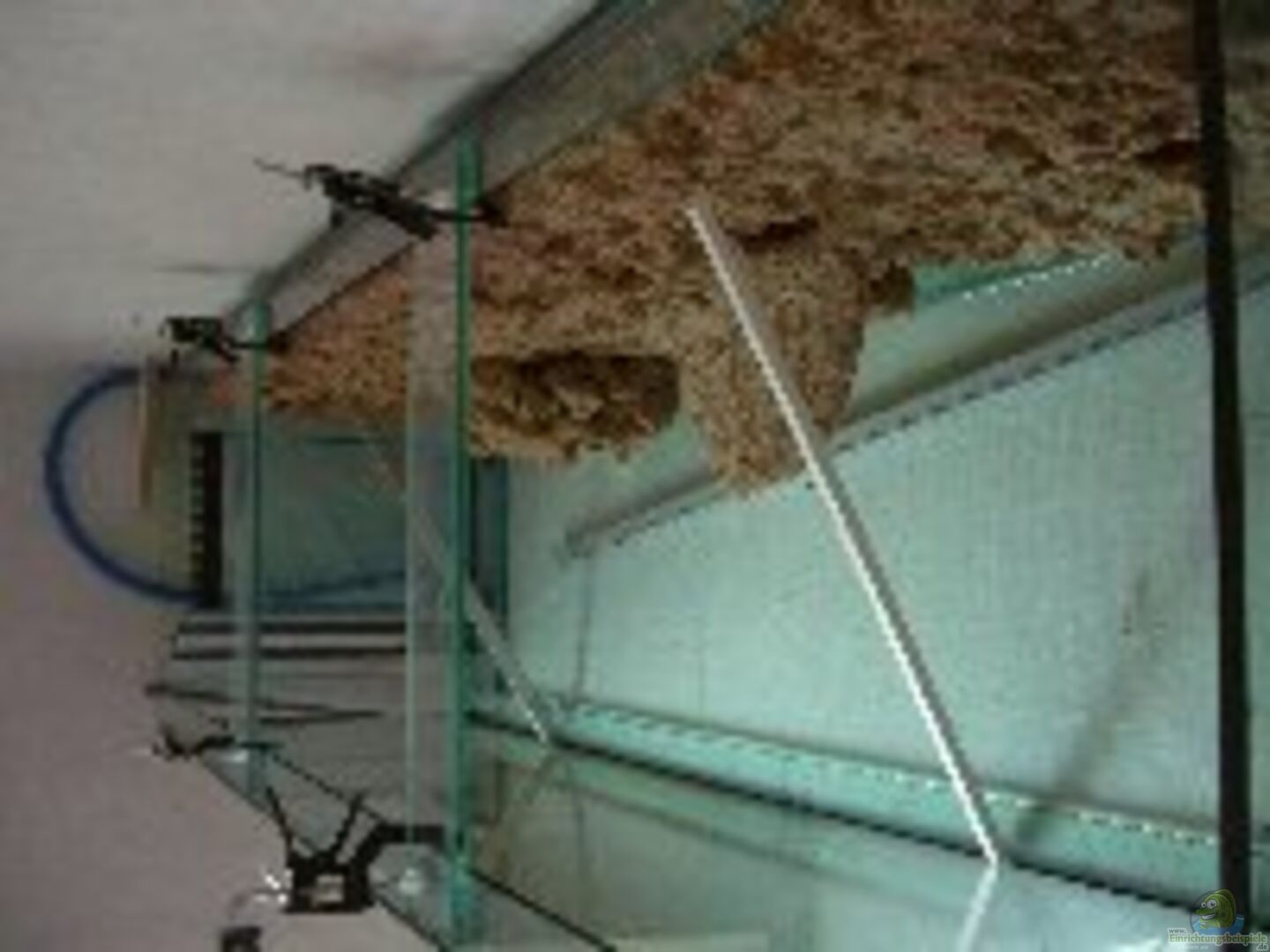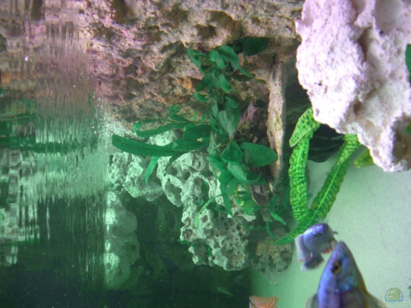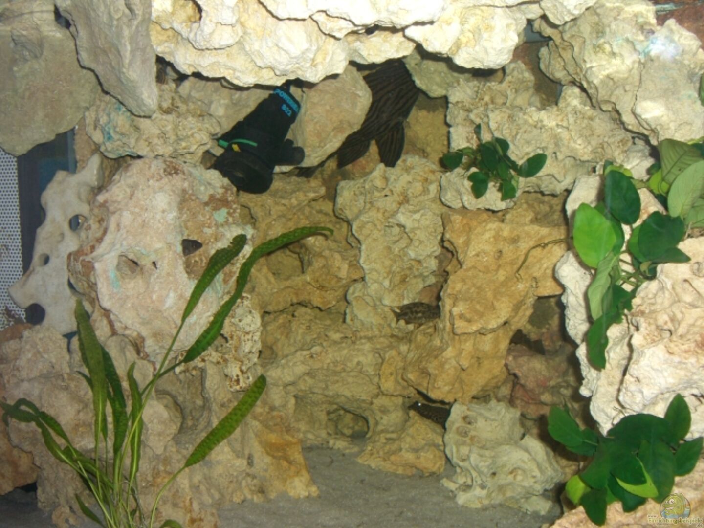ca. 160kg Lochgestein in rot/beige und wei?? (aus meinem alten AQ) zu Höhlen und Versteckmöglichkeiten für die Fische aufgebaut. Auf der linken Seite habe ich unten aus echtem und oben aus künstlichem (wegen dem Gewicht) Lochgestein eine gro??e Höhle gebaut. DAZU MU?? ICH SAGEN DAS ICH DIE IDEE AUF DIESER SEITE GESEHEN HABE UND ES MIR SO GEFALLEN HAT, DA?? ICH ES AUCH GEBAUT HABE. Die Steine am ??berhang gehen bis an die Wasseroberfläche und sind an eine Plexiglasscheibe befestigt.