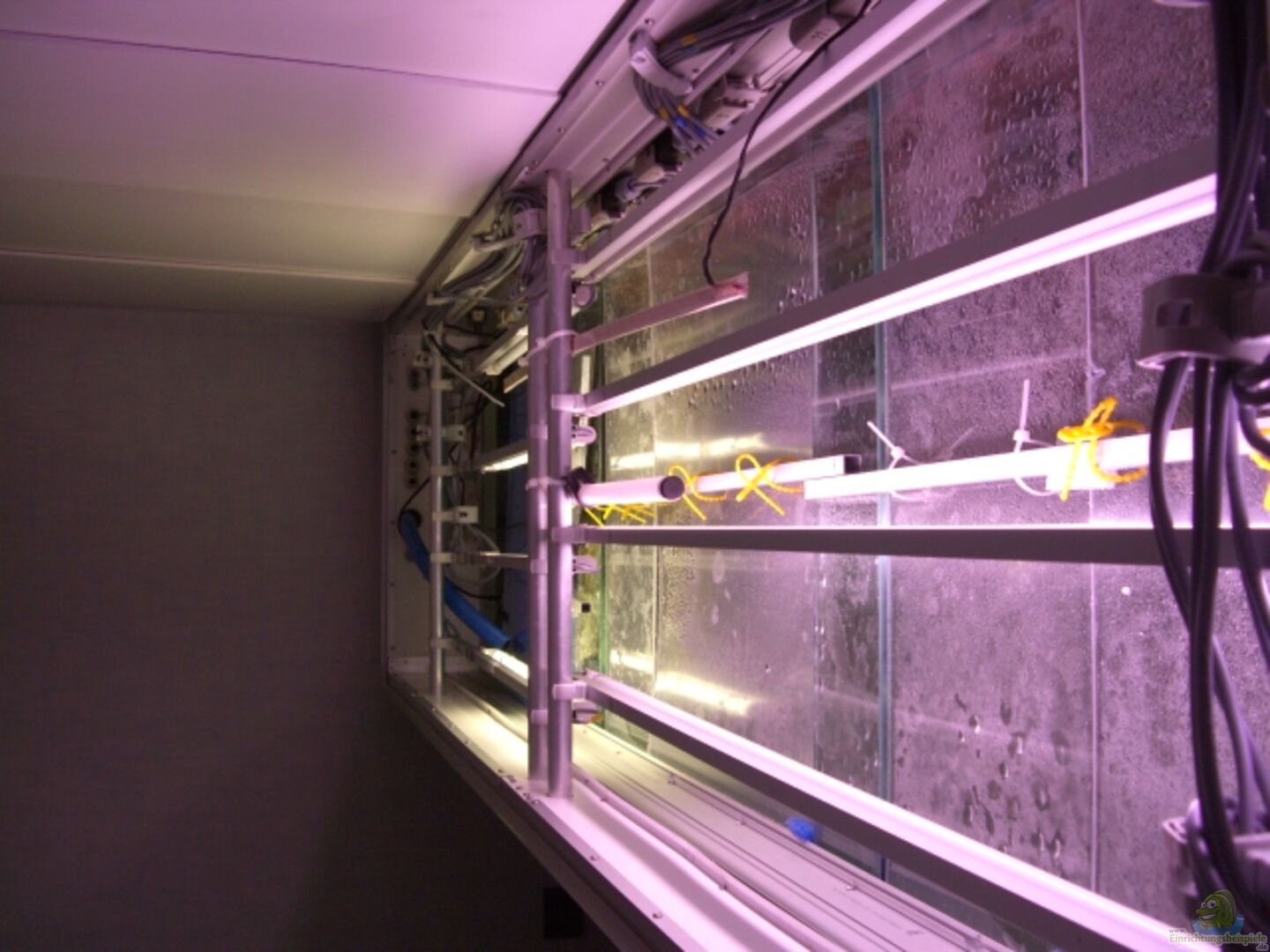 Die Beleuchtung wurde selbst gebaut und besteht aus 4Stück 54W und 4Stück 24W T5 Leuchtstoffröhren mit EVG´s. Alle Röhren sind getrennt durch Zeitschaltuhren schaltbar. Die Leuchtbalken sind aus 4kant ALU-Rohren, auf denen die Fassungen geschraubt wurden. An den 4kant-Rohren sind Kunststoff-Klemmschellen aufgeschraubt die man auf ALU-Rohre (diese sind mit dem Rahmen von der Abdeckung verschraubt) aufstecken kann, somit kann man die Leuchten jederzeit heraus nehmen und verschieben wie man will. Die Leuchten werden mit einem Stecker mit den Steckern in der Abdeckung-Innenseite verbunden.