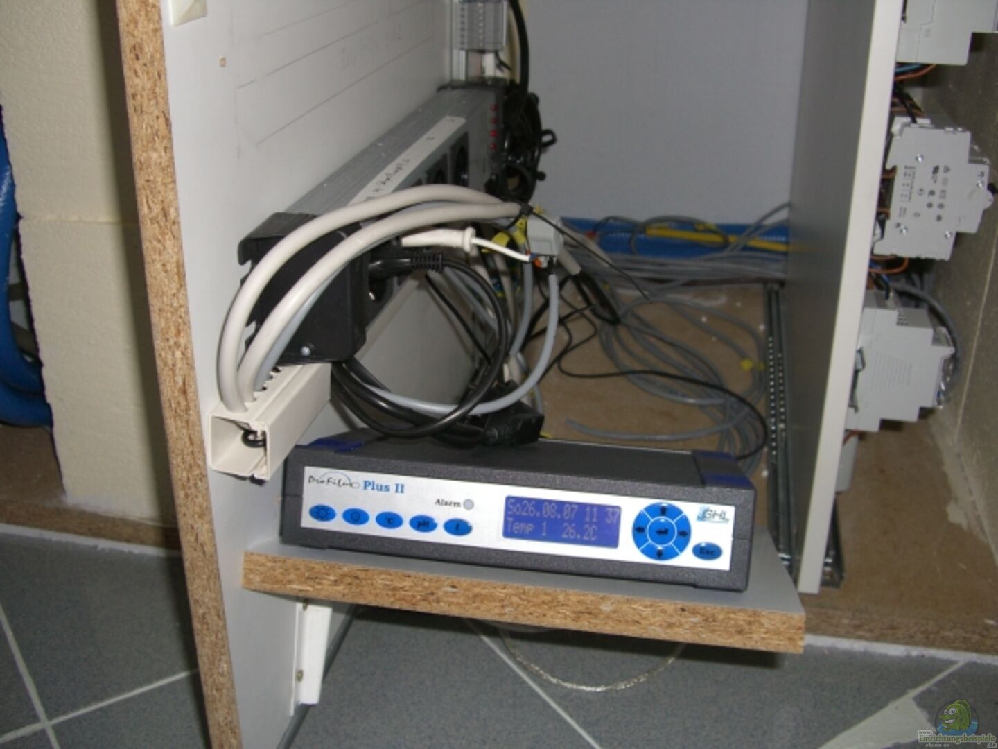 Zur Steuerung wurde Zusätzlich ein Computer von GHL Typ: Profilux Plus II eingebaut. Der Profilux steuert die Heizung (Heizstab 300W von Jäger), die Strömungspumpe von Tunze und das Mondlicht/Sonnenaufgang/Wolkenzug. Da der GHL noch vieles mehr kann und ich mich auch noch mehr damit befasse werden in der nächsten Zeit noch einige Dinge mehr über den GHL laufen. Wobei ich nur die Spielereien über den GHL laufen lasse.