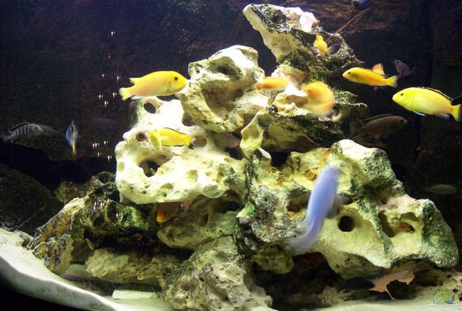 In der Mitte wurde ein Kalklochstein-Riff erstellt. Hierbei habe ich darauf geachtet, dass hier gro??e Löcher vorhanden sind und das Riff von allen Seiten zugänglich ist. Somit konnten viele Reviere gebildet werden.