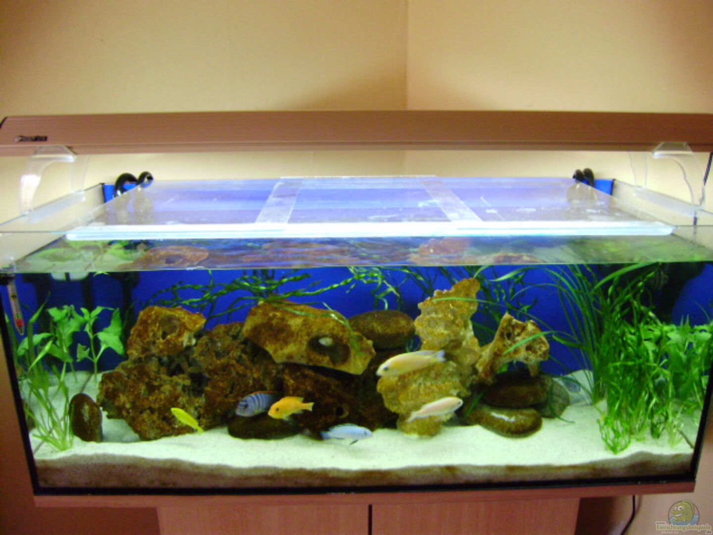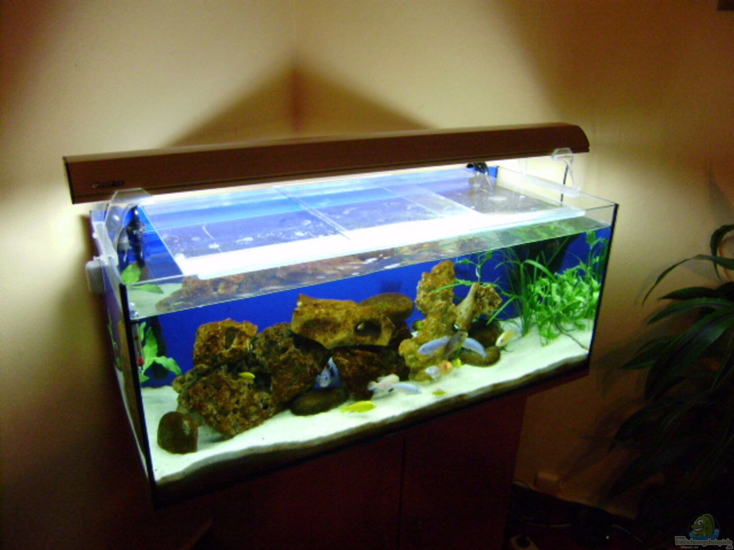 Von 250 Liter Becken habe ich auf 375 Liter gewechselt. Ma??e 150x50x50cm. Glasssträrke 10mm . Aufsetzleuchte mit JBL Nature 58 Watt und Marine-glo 58 Watt als Nachtlicht.