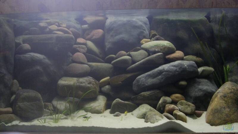 Die Rückwand ist eigentlich keine sondern aus Zement gebaute Felsen. Diese sind von innen hohl und bieten den Mbunas somit die Möglichkeit das ganze Becken zu durchschwimmen. Zudem sind hinter diesen noch Steine im unteren Bereich so das die gö??eren Höhlen noch mal unterteilt sind. Zusammen mit dem Steinaufbau vorne hab ich somit den Platz optimal genutzt um genug Versteckmöglichkeiten zu bieten.