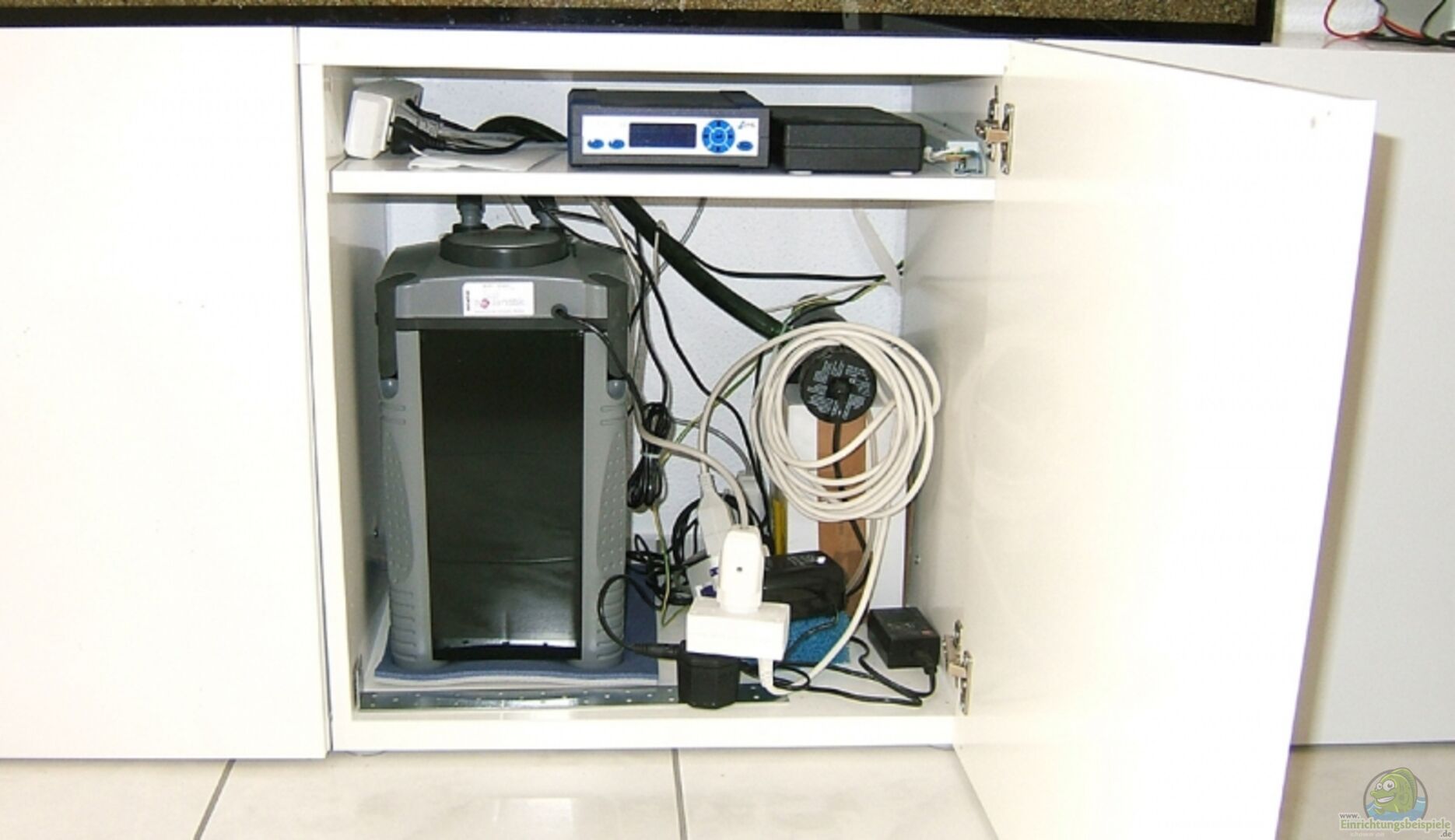 Selbstgebaute Beleuchtung: Vierkannt Alurohr Masse: 4.5 x 4.5 cm und 1.57m. Leuchtstoffröhren-Fittinge auf zwei Seiten. Je Sechs LEDs an der Unterseite eingebaut für Morgen- Abendrot und Mondlicht. Alles wird durch ein Aquarium-Computer ProfiLux II gesteuerrt. Das Vorschaltgerät habe ich bewusst nicht im Alurohr eingebaut, (unerwünschte Wärmeabstrahlung in der Abdeckung) sondern befindet sich im Filterraum unter dem Aquarium.
