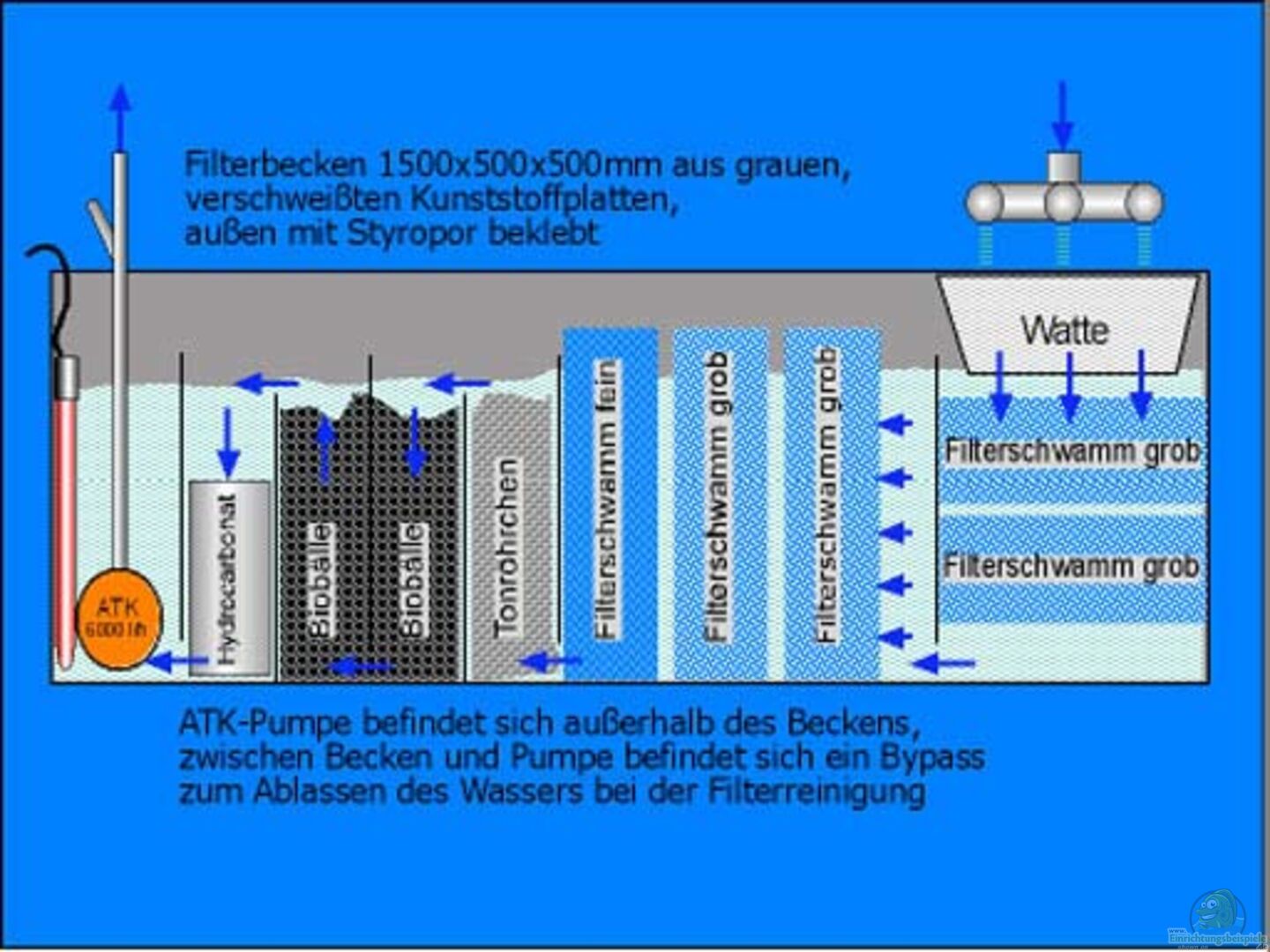 Unter dem Becken befindet sich ein 375 Liter Filterbecken aus Kunststoff, welches mit Filterschwämmen, Tonröhren und Biobällen gefüllt ist.