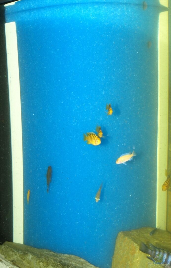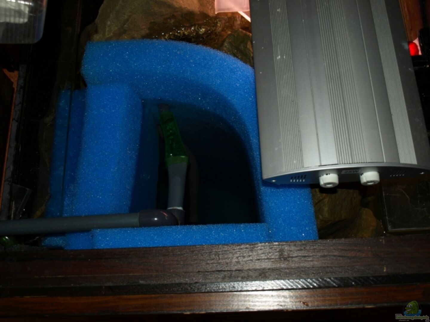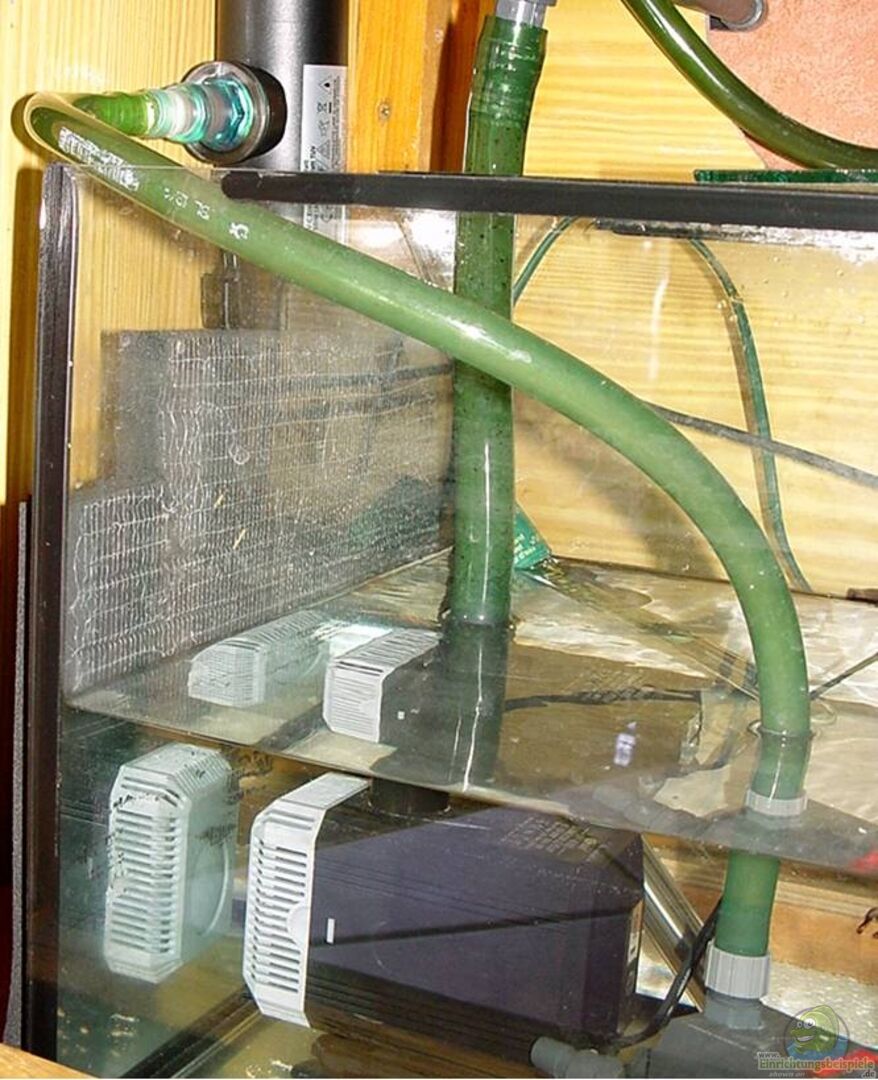 1 Hamburger Mattenfilter Schenkelma?? 30 x 30 cm Höhe 68 cm in der linken Beckenseite mit einer Filterfläche von 0, 33 Quadratmeter 5 cm dick und 2 x Hagen Aqua Clear Powerhead 802 wird gleichzeitig als Strömungspumpe verwendet