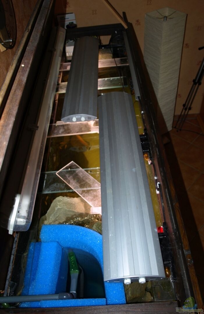 ab9.30 - 20.00 Uhr ein Aluleuchtbalken T8 mit 2 x 25 Watt jeweils eine TROCAL-de Luxe African-Lake25 Watt und eine JBL Solar Color 25 Watt