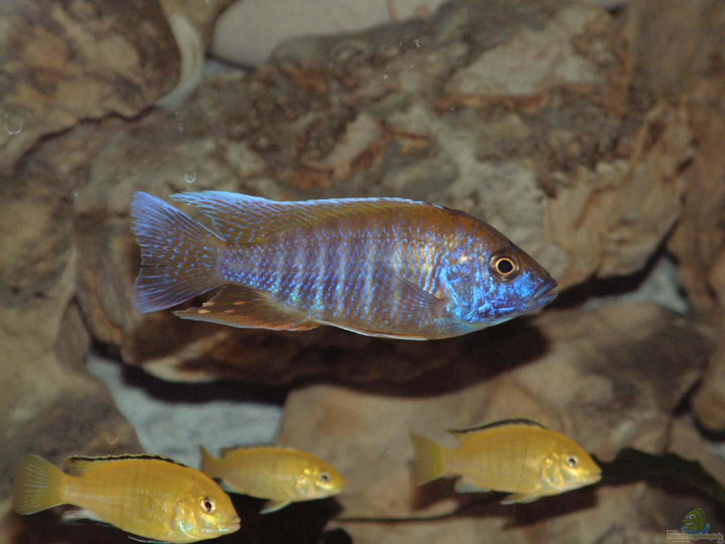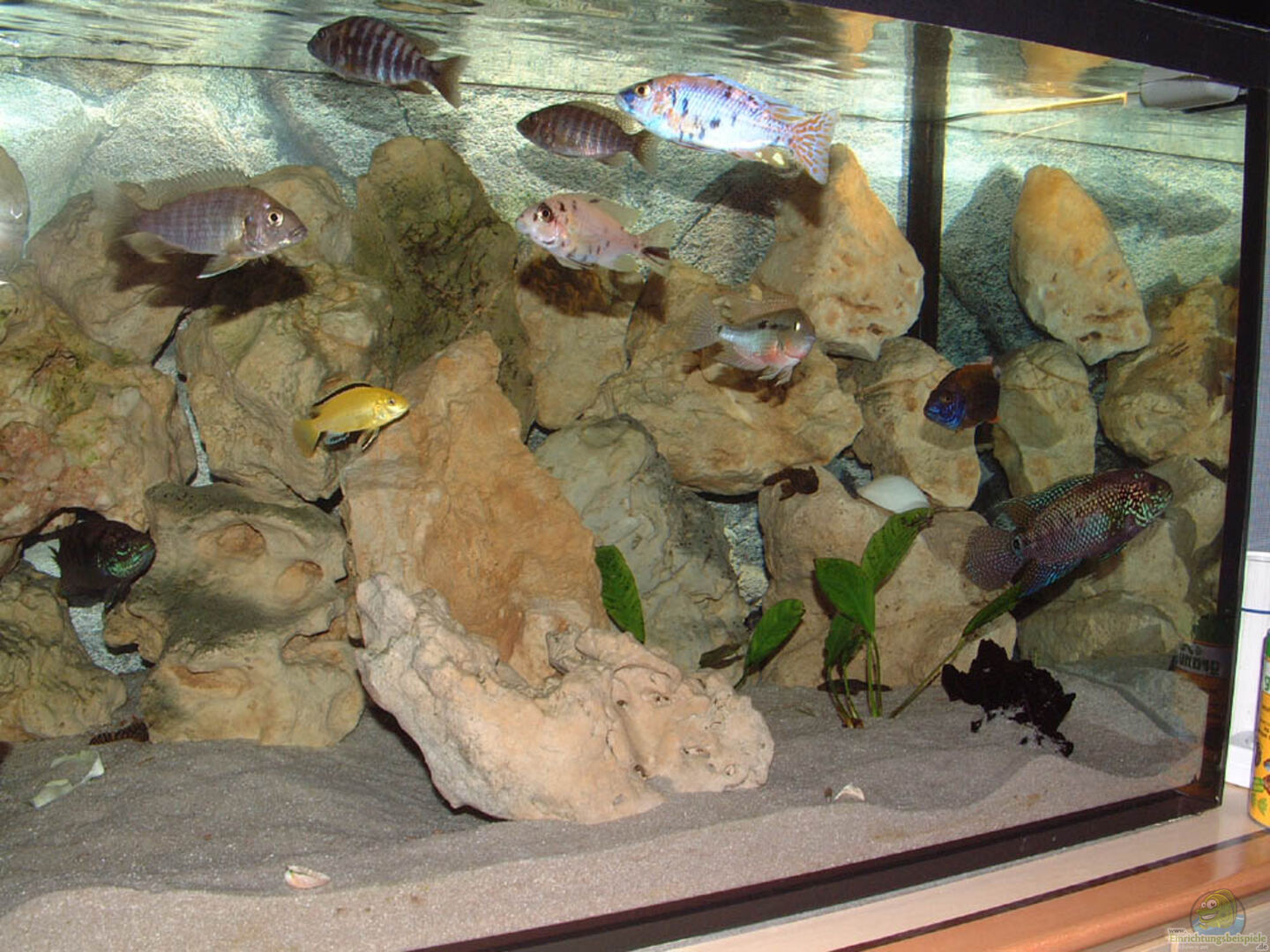 Soweit man das auf den sehr kleinen Bildern erkennen kann, wurde das Becken sehr schön für Felscichliden eingerichtet. Leider passt der Besatz nicht so ganz zur Einrichtung, da wohl nur die wenigen Yellows die hohen Steinaufbauten wirklich nutzen. Für die Aulonocaras sollten dagegen mehr freie Sandflächen geschaffen werden.
